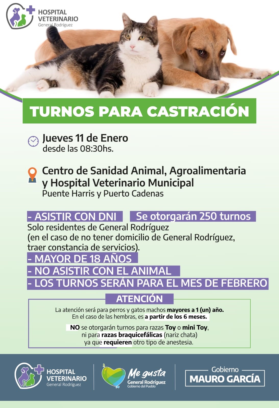 La atención será destinada a perros y gatos machos, mayores de un año y en el caso de las hembras, a partir de los 6 meses. También aclaran desde el área de zoonosis, que no se entregaran turnos para la castración de razas Toy o minitoy, ni para razas braquicefálicas (nariz achatada), ya que requieren otro tipo de anestesia.