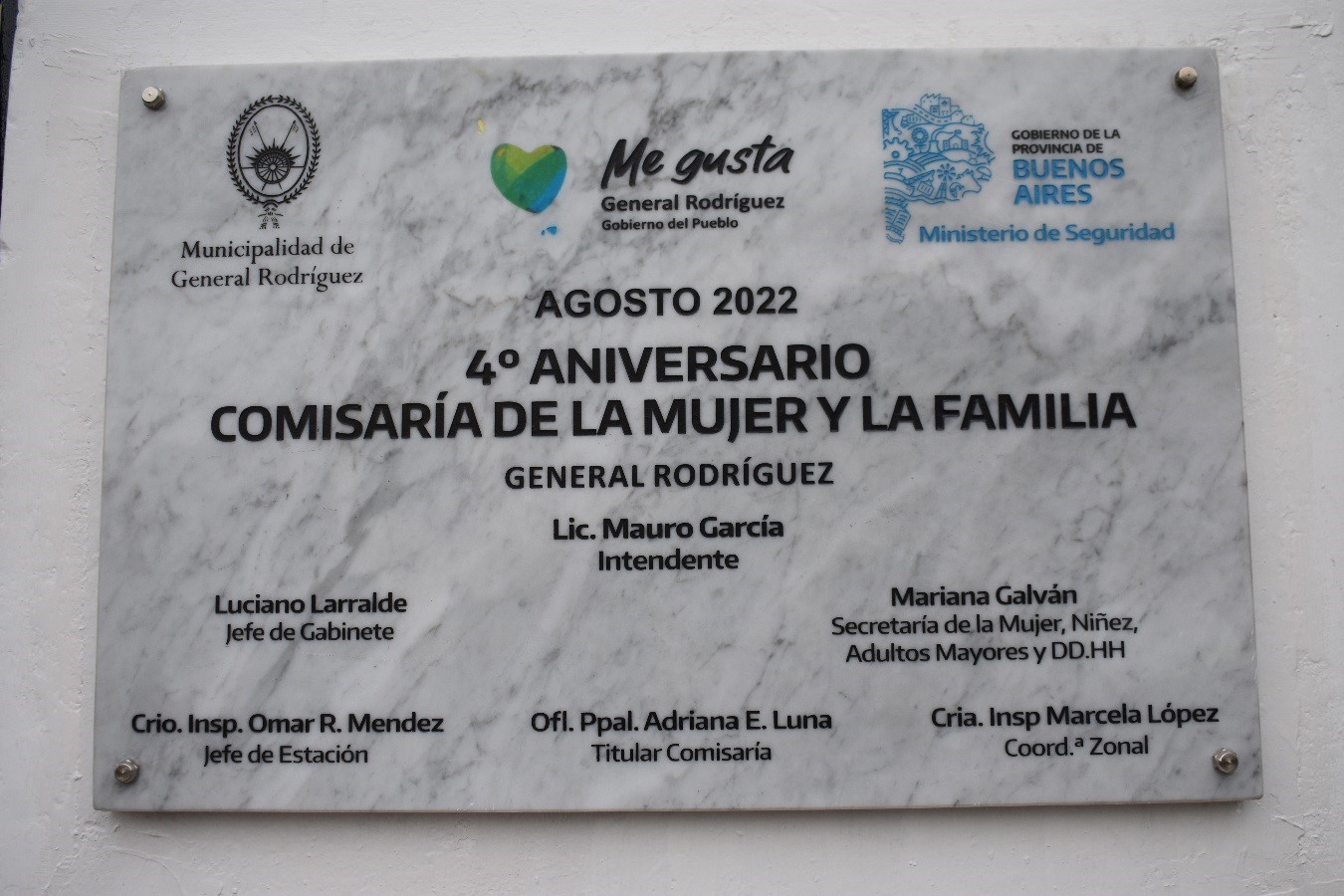 El martes 9 de agosto se conmemoró el cuarto aniversario de la creación de la Comisaria de la Mujer y Familia de General Rodríguez con la presencia del Intendente Mauro García, personal policial y funcionarios de gobierno.