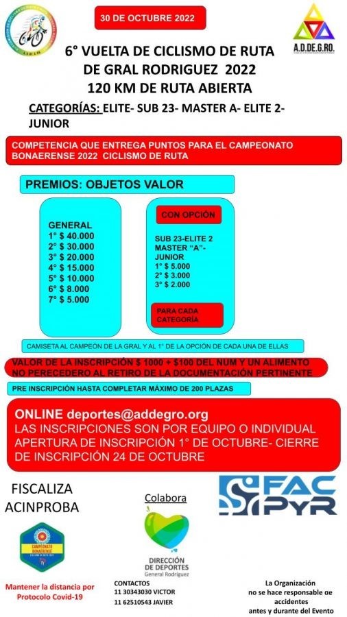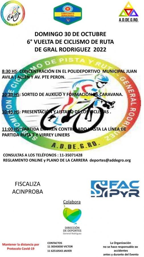 La carrera será fiscalizada por ACINPROBA, colabora la Dirección de Deportes de General Rodríguez y la Federación Argentina de Ciclismo de Pista y Ruta.