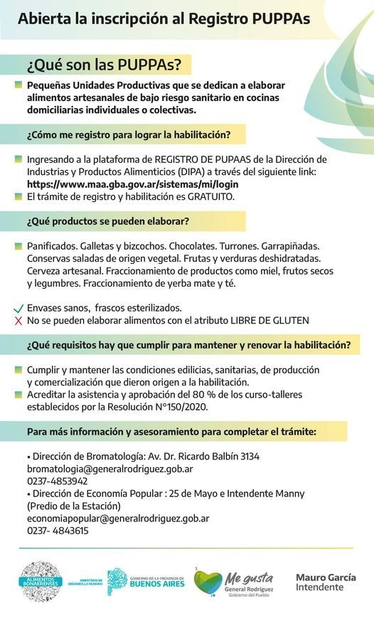 El gobierno de la Municipalidad de General Rodríguez informó que se encuentra abierta la inscripción al registro de las Pequeñas Unidades Productivas de Productos Artesanales (PUPPAs), que apunta al fomento, regularización y capacitación para aquellas personas que tienen o están pensando en desarrollar un emprendimiento destinado a la elaboración de alimentos artesanales de bajo riesgo sanitario en cocinas domiciliarias individuales o colectivas.