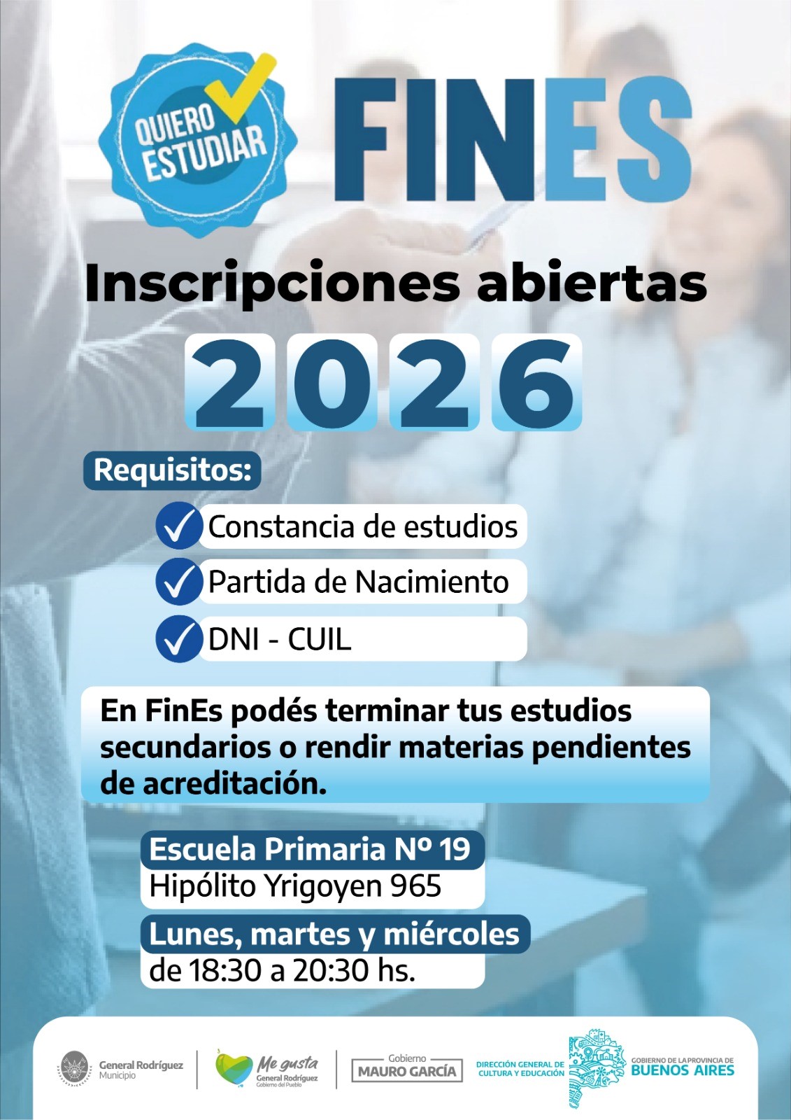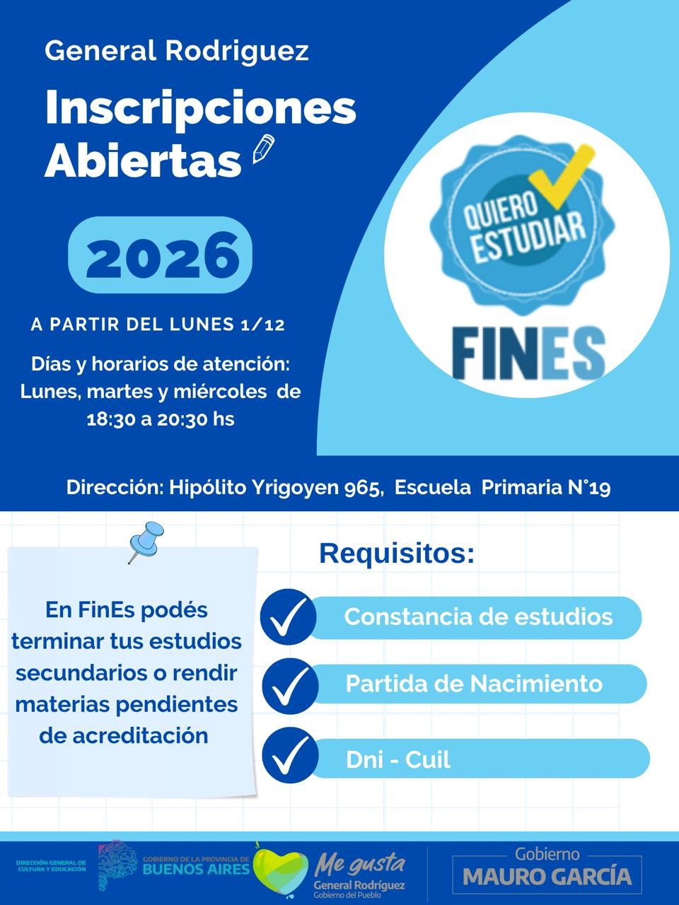 El Programa FinEs abrió la preinscripción para el ciclo 2026 en General Rodríguez, una iniciativa destinada a jóvenes y adultos que deseen finalizar sus estudios secundarios. La convocatoria está dirigida a personas mayores de 18 años que no hayan completado este nivel educativo.