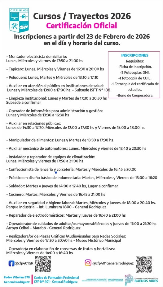 Las personas interesadas podrán solicitar información y realizar la inscripción de lunes a viernes, de 14:00 a 18:00, en la sede ubicada en: Pedro Whelan 878, General Rodríguez