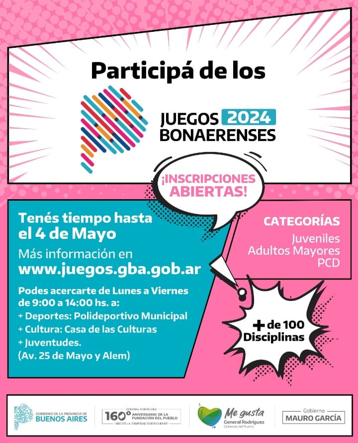 El Municipio de General Rodríguez informa a la comunidad que se encuentran abiertas las inscripciones para participar de la 33° edición de los Juegos Bonaerenses, la competencia deportiva y cultural más importante de la provincia.