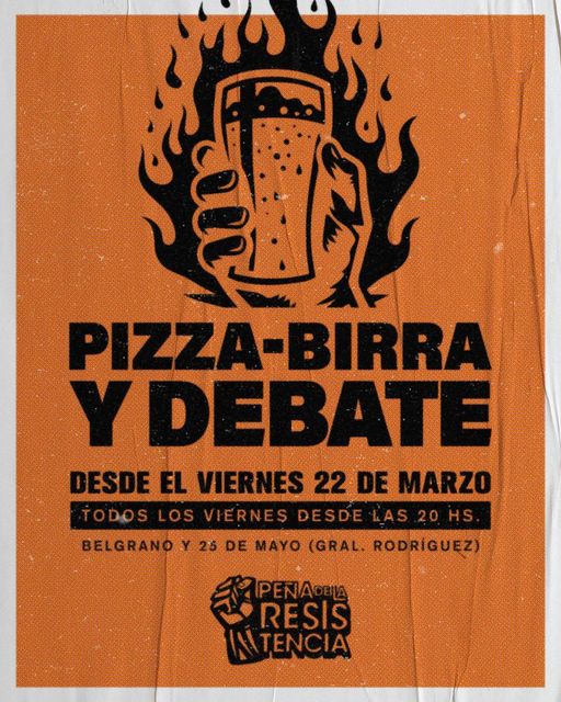 “Pizza, birra y debate” se lleva a cabo todos los viernes desde las 20hs. Se trata de un encuentro donde todos y todas puedan, más allá del espacio o bandera política al que cada uno pertenezca, juntarse y debatir acerca del momento que hoy toca atravesar. “Desde la Peña de la Resistencia entendemos que el enemigo es uno solo y que hay que dejar la mezquindad de lado”, sostuvo Reinaldo Torres, referente del espacio.