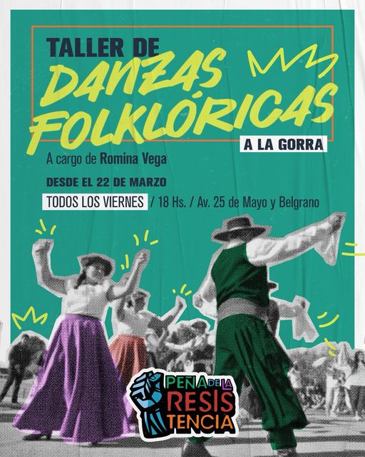 Mientras que el taller de danzas folklóricas, a cargo de la profesora Romina Vega, se realiza todos los viernes a las 18hs y es a la gorra. Este taller surgió por pedido de quienes participan todos los meses de la peña y no tienen conocimiento de las diferentes danzas, para luego poder bailar y disfrutar de la noche completa.