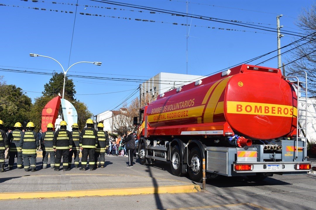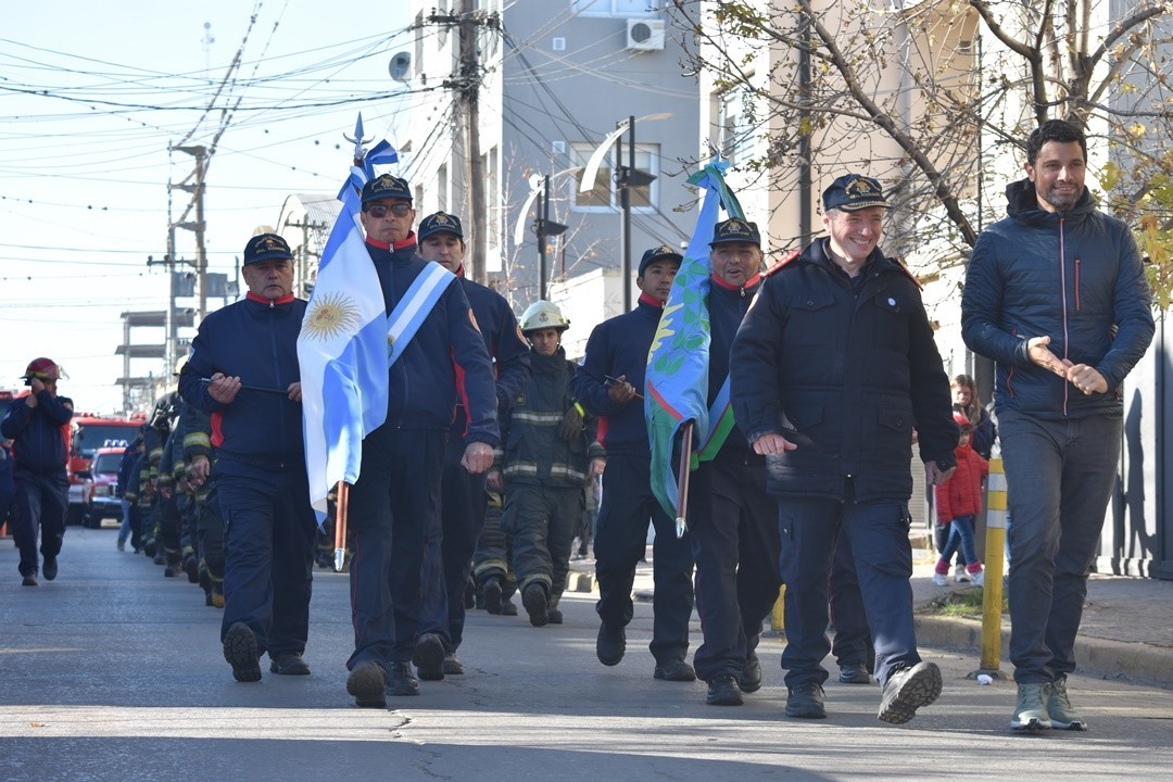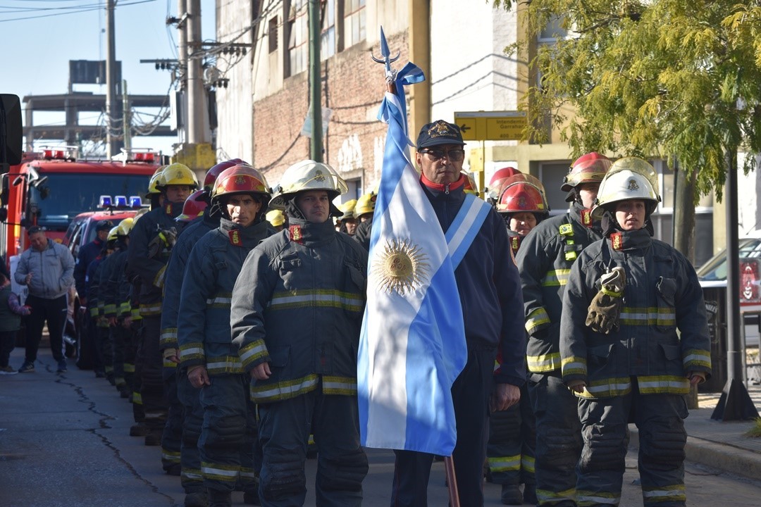 La jornada inicio en el cuartel de Bomberos Voluntarios de General Rodríguez y desde allí todo el destacamento marcho hasta la esquina de Avenida España, donde está dedicado el monumento alusivo a la fecha.