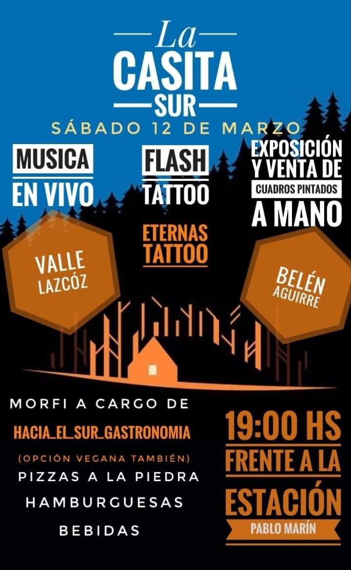 - Descripción de la jornada: El primer evento de La Casita Sur contará con música en vivo, flash tatto, exposición y venta de cuadros pintados a mano. También habrá opciones de comida vegana, pizzas a la piedra, hamburguesas y bebidas.