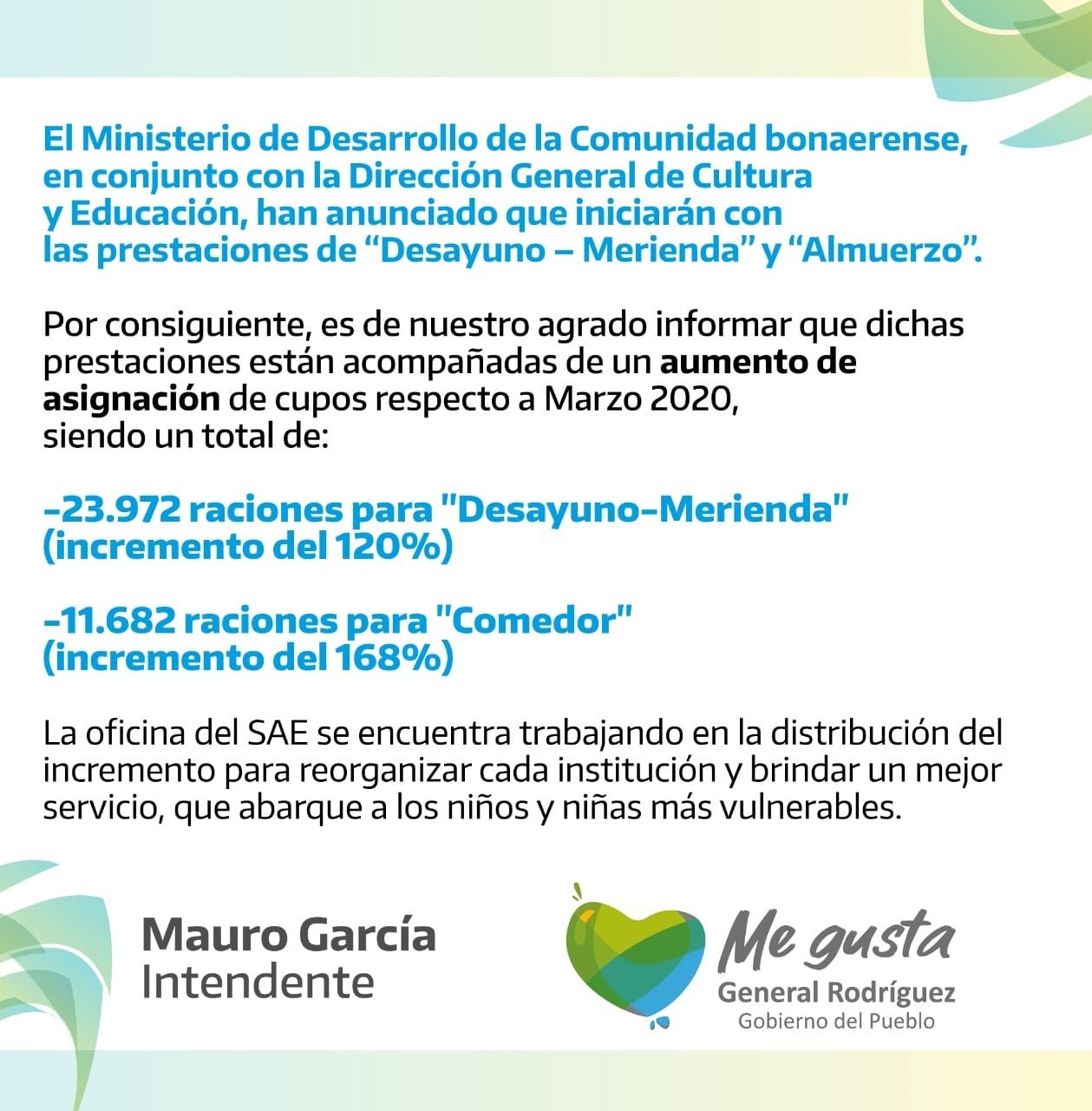 Autoridades del Servicio Alimentario Escolar (SAE) de General Rodríguez anunciaron el inicio de las prestaciones de Desayuno, Almuerzo y Merienda (DMC) en las escuelas públicas del distrito. Las mismas se retoman con importantes aumentos en la cantidad de cupos.