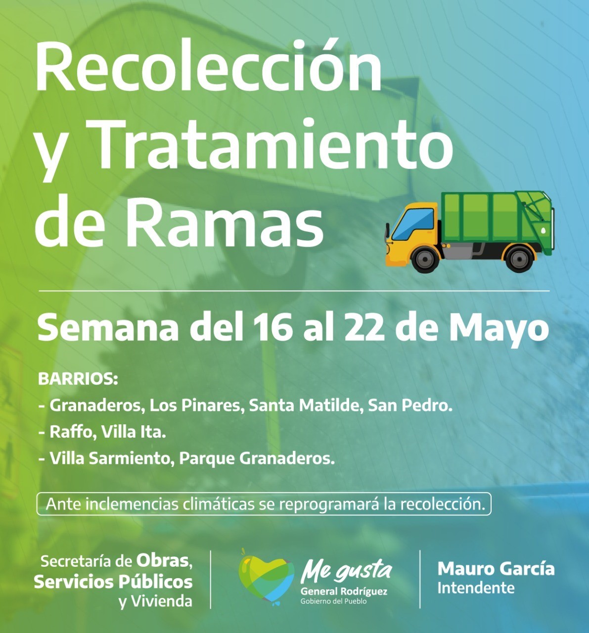 Del 16 al 22 de mayo el operativo de recolección y tratamiento de ramas será en los barrios Granaderos, Los Pinares, Santa Matilde, San Pedro, Raffo, Villa Ita, Villa Sarmiento y Parque Granaderos.