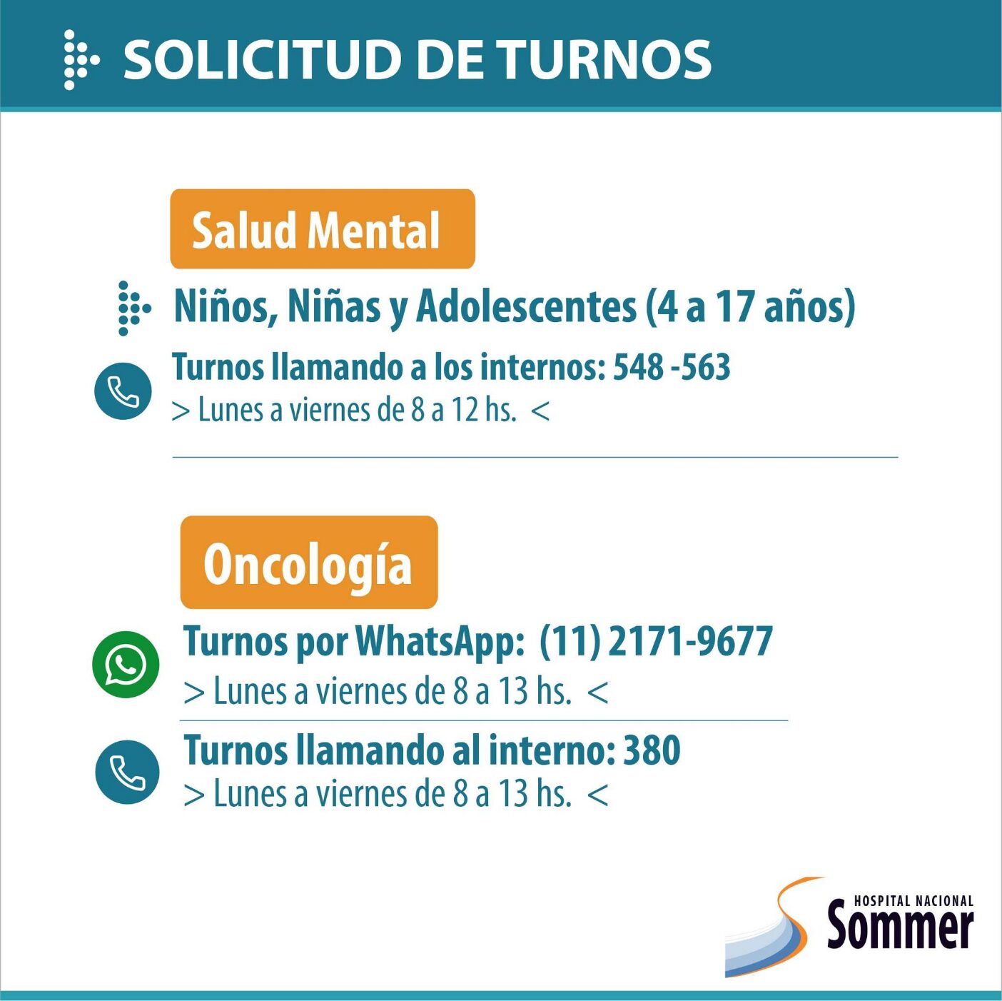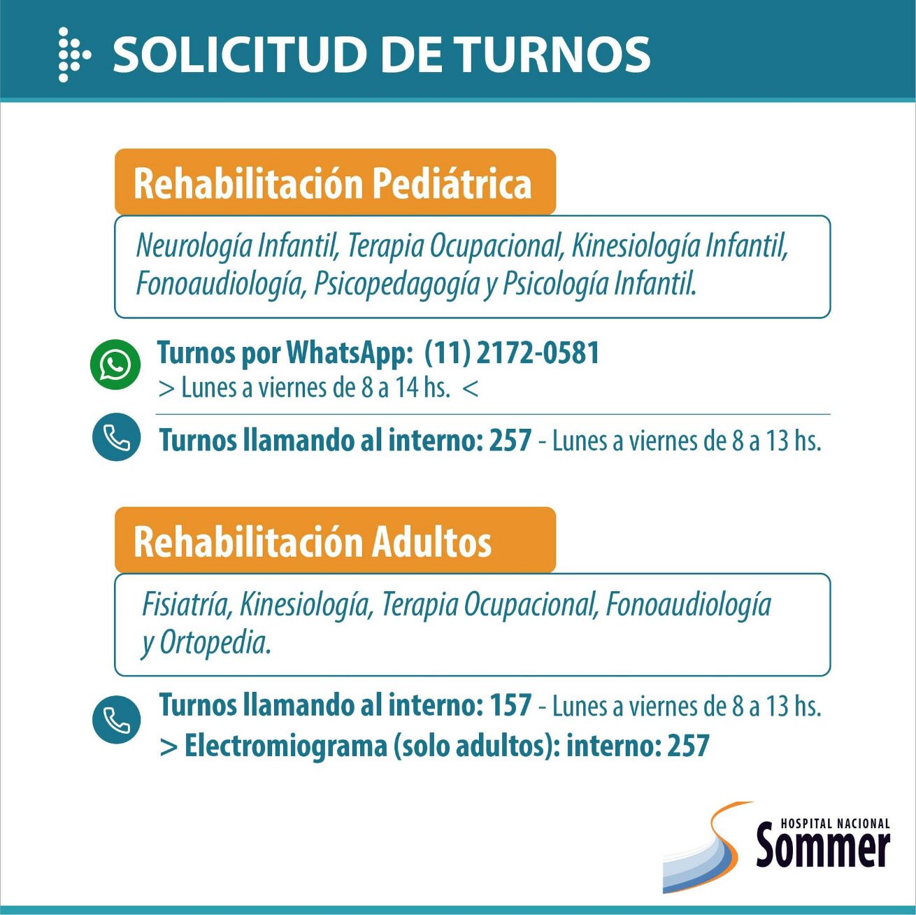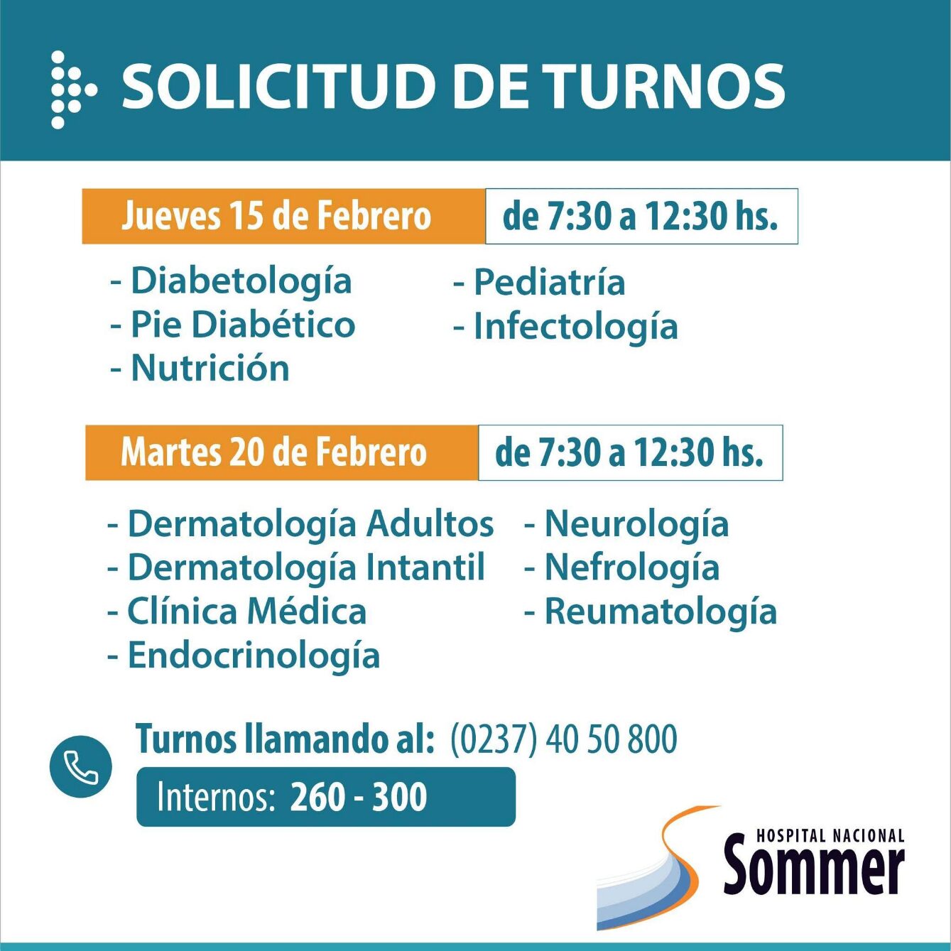 A través de sus redes sociales el Hospital Nacional Baldomero Sommer informó que se encuentra habilitada su agenda de turnos para las diversas especialidades que brinda: Ginecología, Diabetología, Nutrición, Neurología, Cardiología, Salud Mental, entre otros.