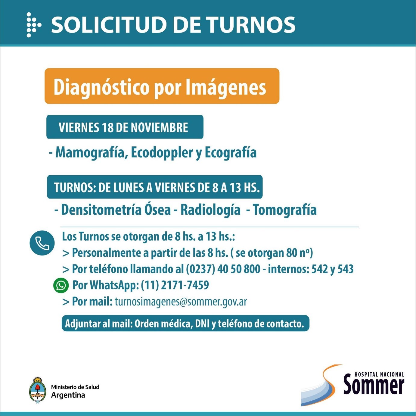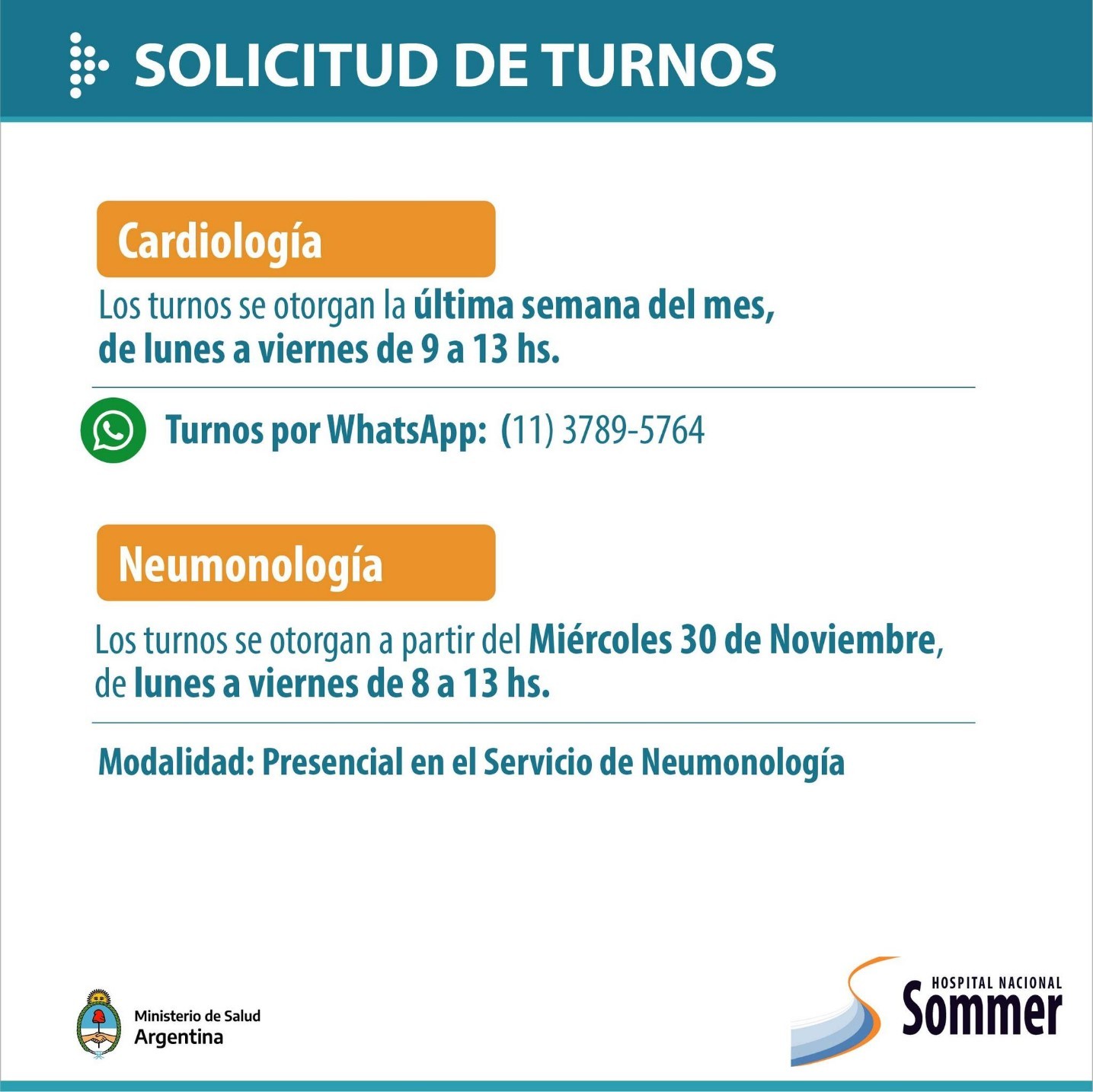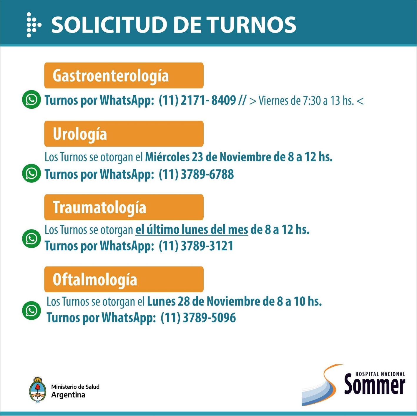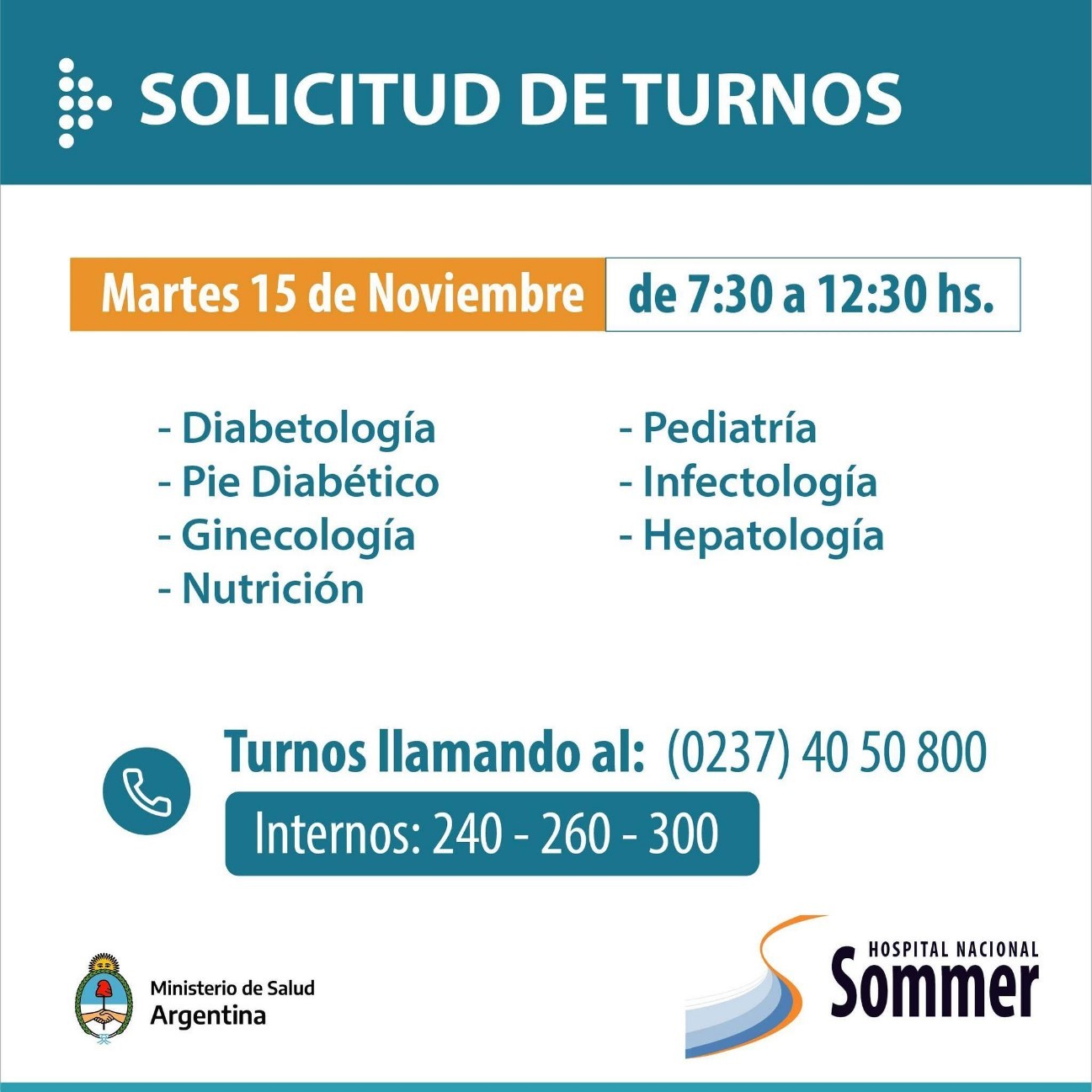 A través de sus redes sociales el Hospital Nacional Baldomero Sommer informó que se encuentra habilitada su agenda de turnos para las diversas especialidades que brinda: Cirugía, Salud mental, Cuidados Paliativos, Oncología, Rehabilitación Pediátrica y Rehabilitación para adultos, entre otros.
