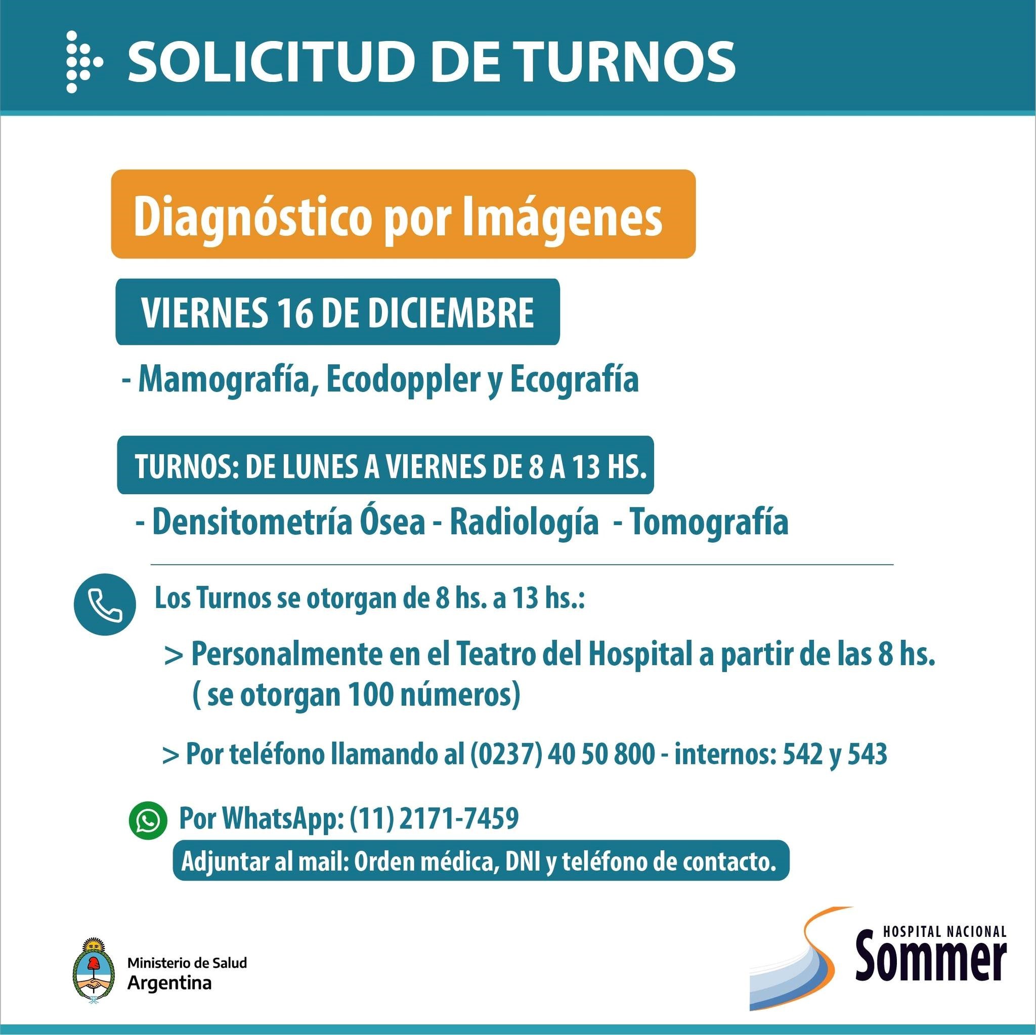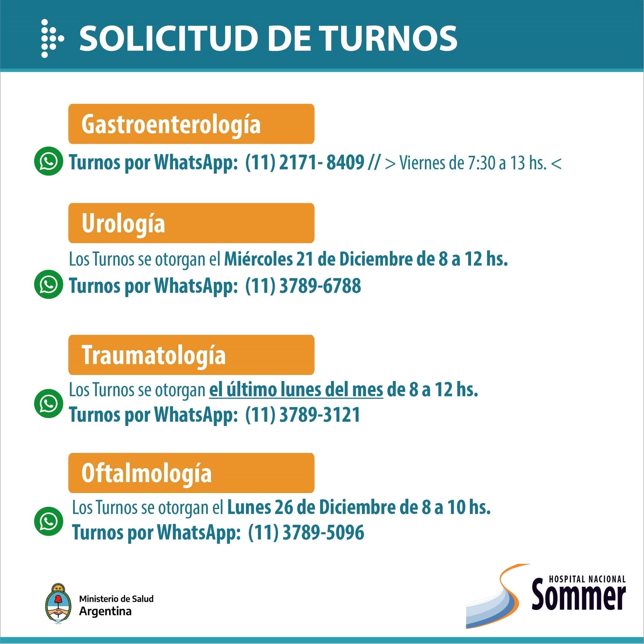 A través de sus redes sociales el Hospital Nacional Baldomero Sommer informó que se encuentra habilitada su agenda de turnos para las diversas especialidades que brinda: Cirugía, Salud mental, Cuidados Paliativos, Oncología, Rehabilitación Pediátrica y Rehabilitación para adultos, entre otros.