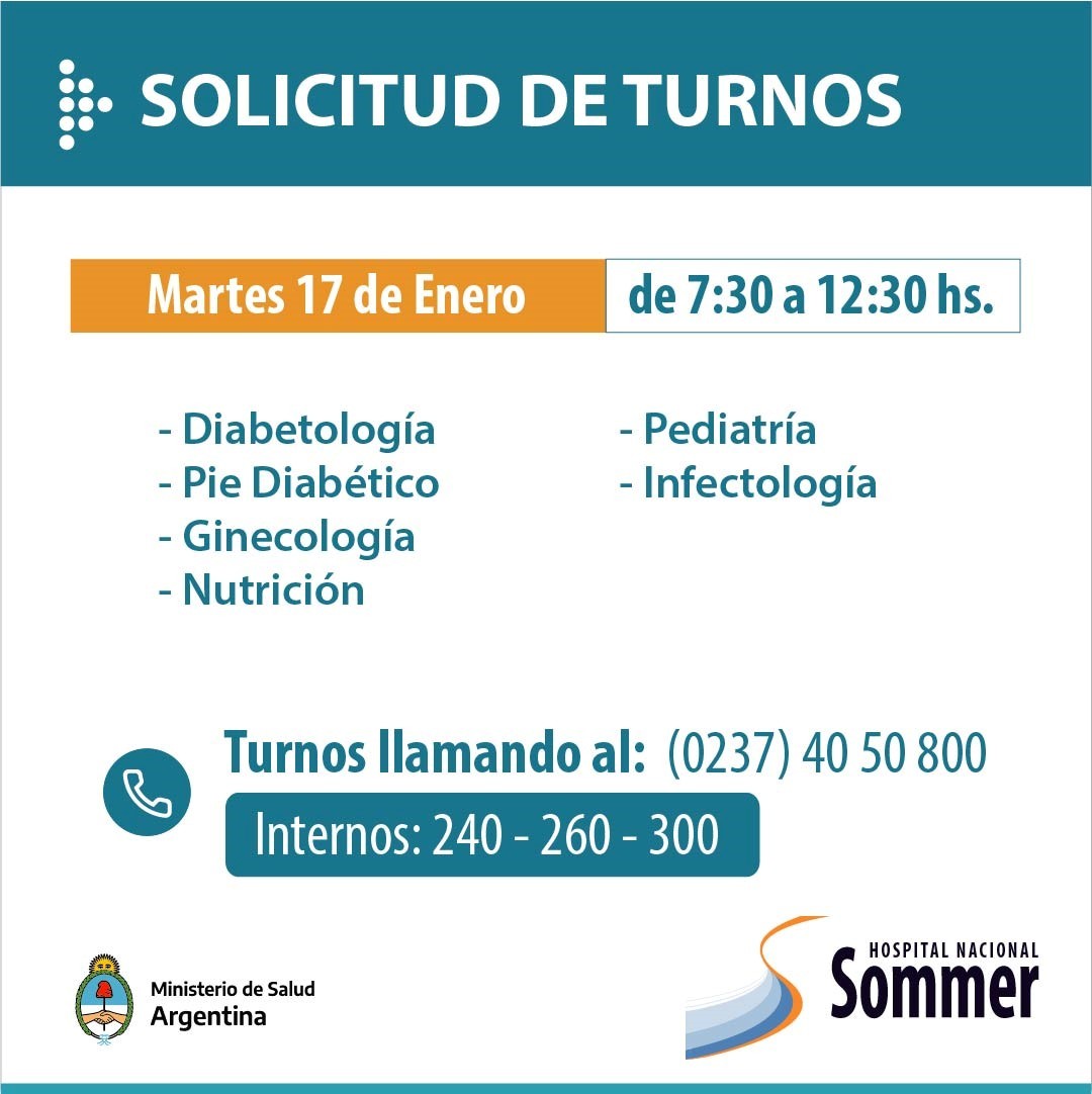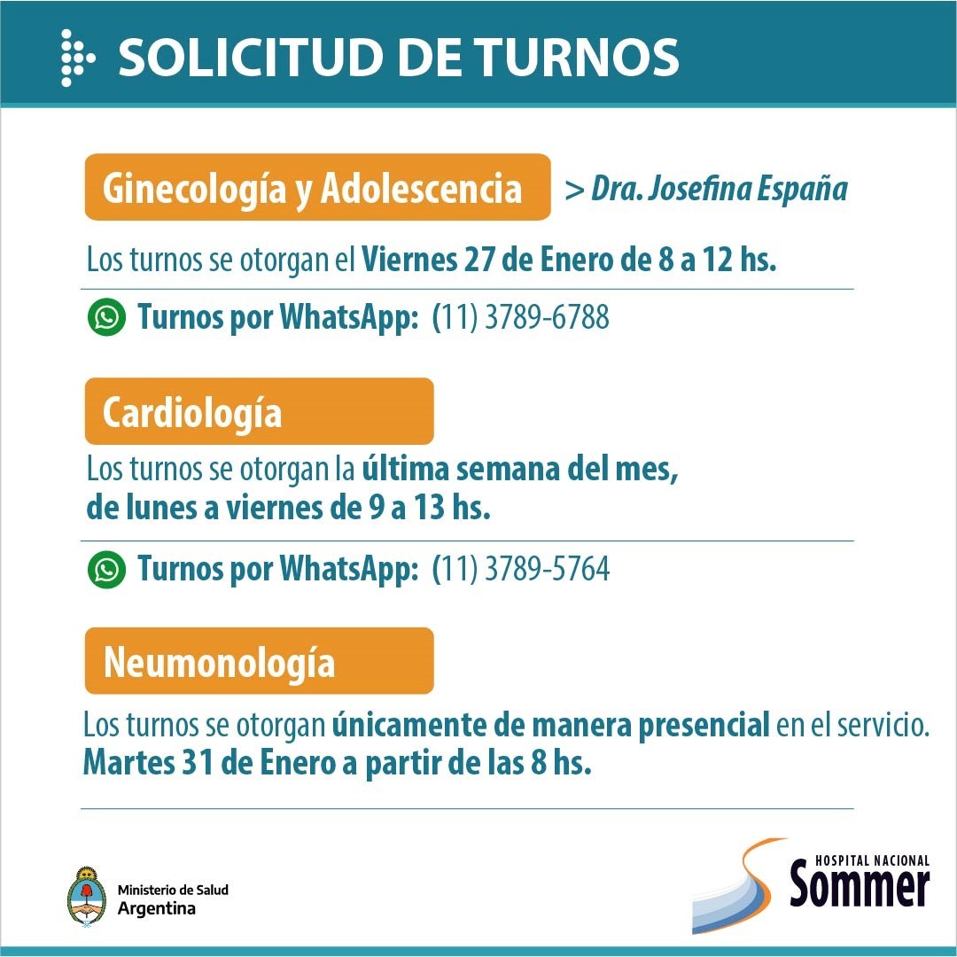 A través de sus redes sociales el Hospital Nacional Baldomero Sommer informó que se encuentra habilitada su agenda de turnos para las diversas especialidades que brinda: Cirugía, Salud mental, Cuidados Paliativos, Oncología, Rehabilitación Pediátrica y Rehabilitación para adultos, entre otros.