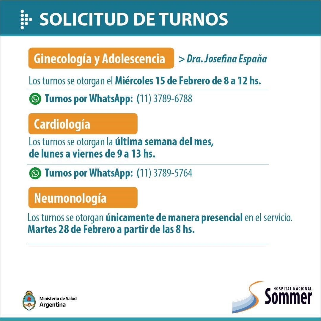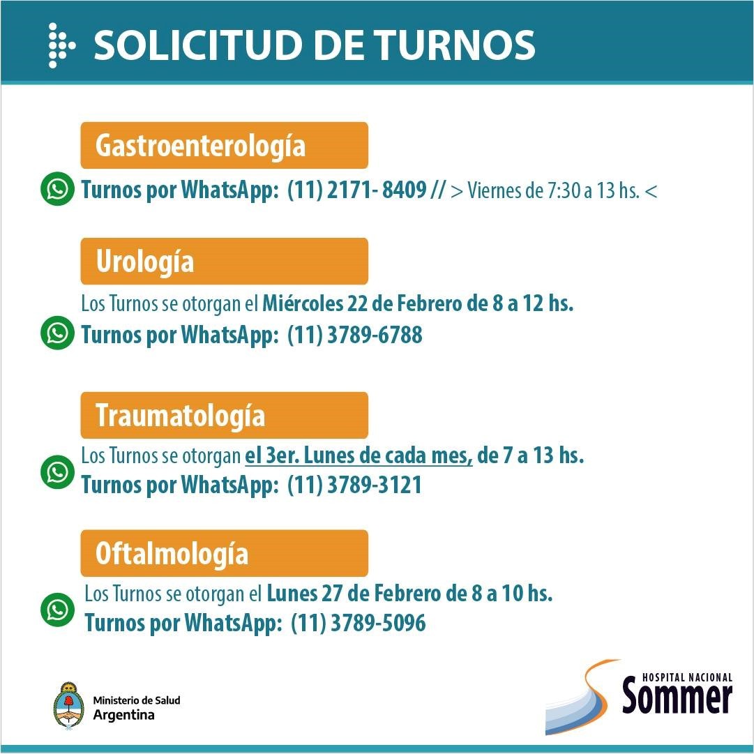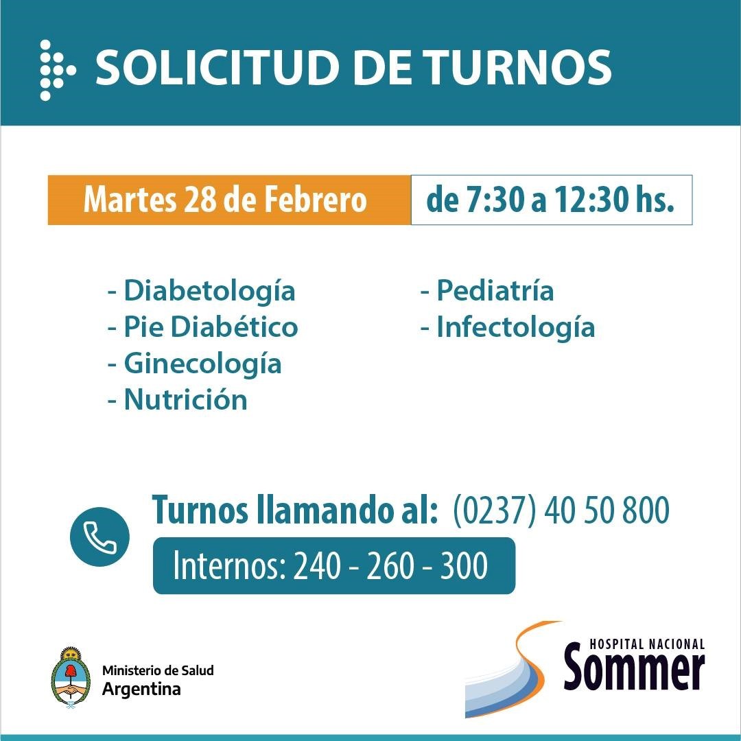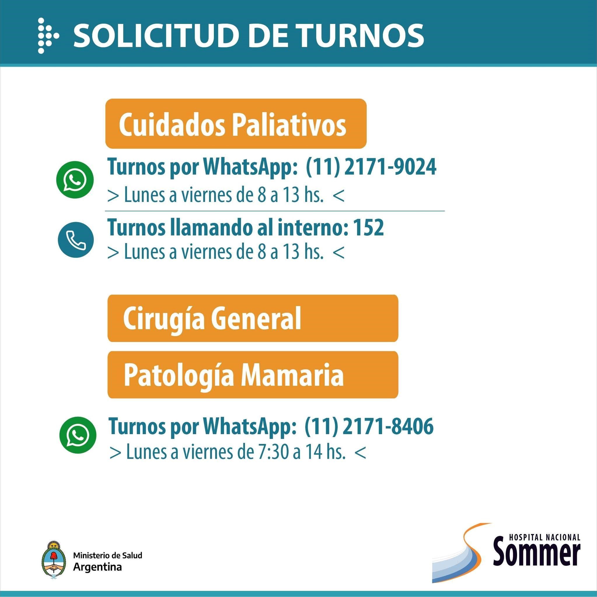 A través de sus redes sociales el Hospital Nacional Baldomero Sommer informó que se encuentra habilitada su agenda de turnos para las diversas especialidades que brinda: Cirugía, Salud mental, Cuidados Paliativos, Oncología, Rehabilitación Pediátrica y Rehabilitación para adultos, entre otros.