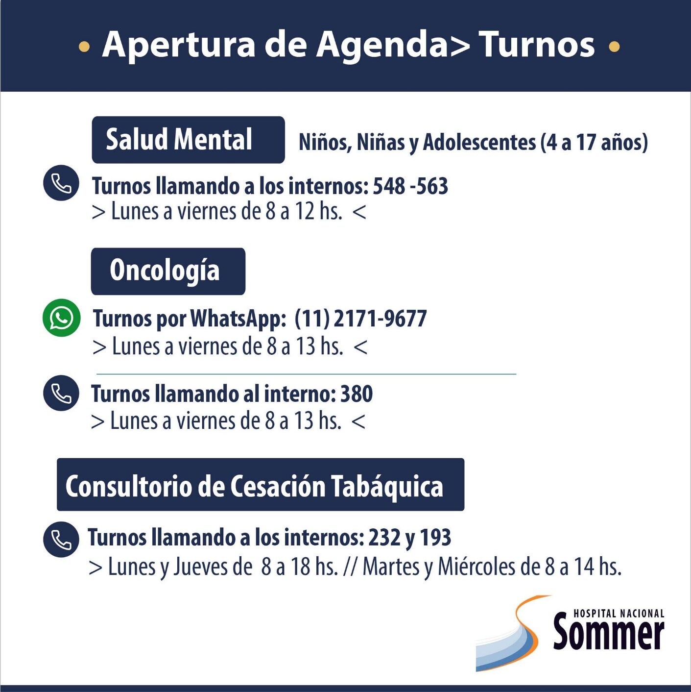 A través de sus redes sociales el Hospital Nacional Baldomero Sommer informó que se encuentra habilitada su agenda de turnos para las diversas especialidades que brinda: Ginecología, Diabetología, Nutrición, Neurología, Cardiología, Salud Mental, entre otros.