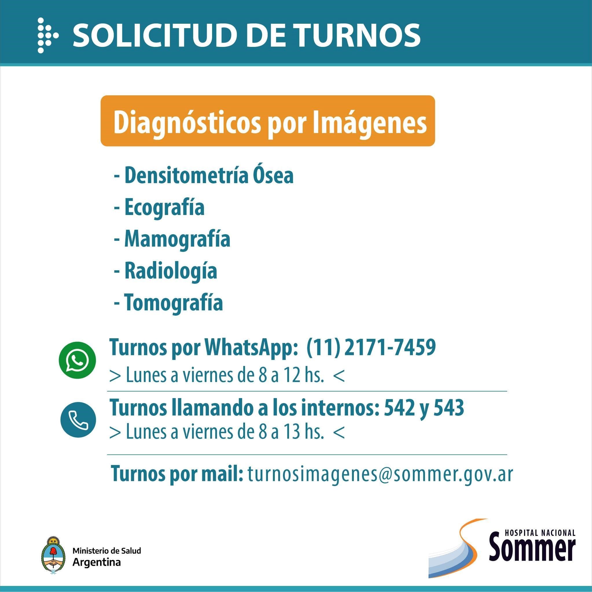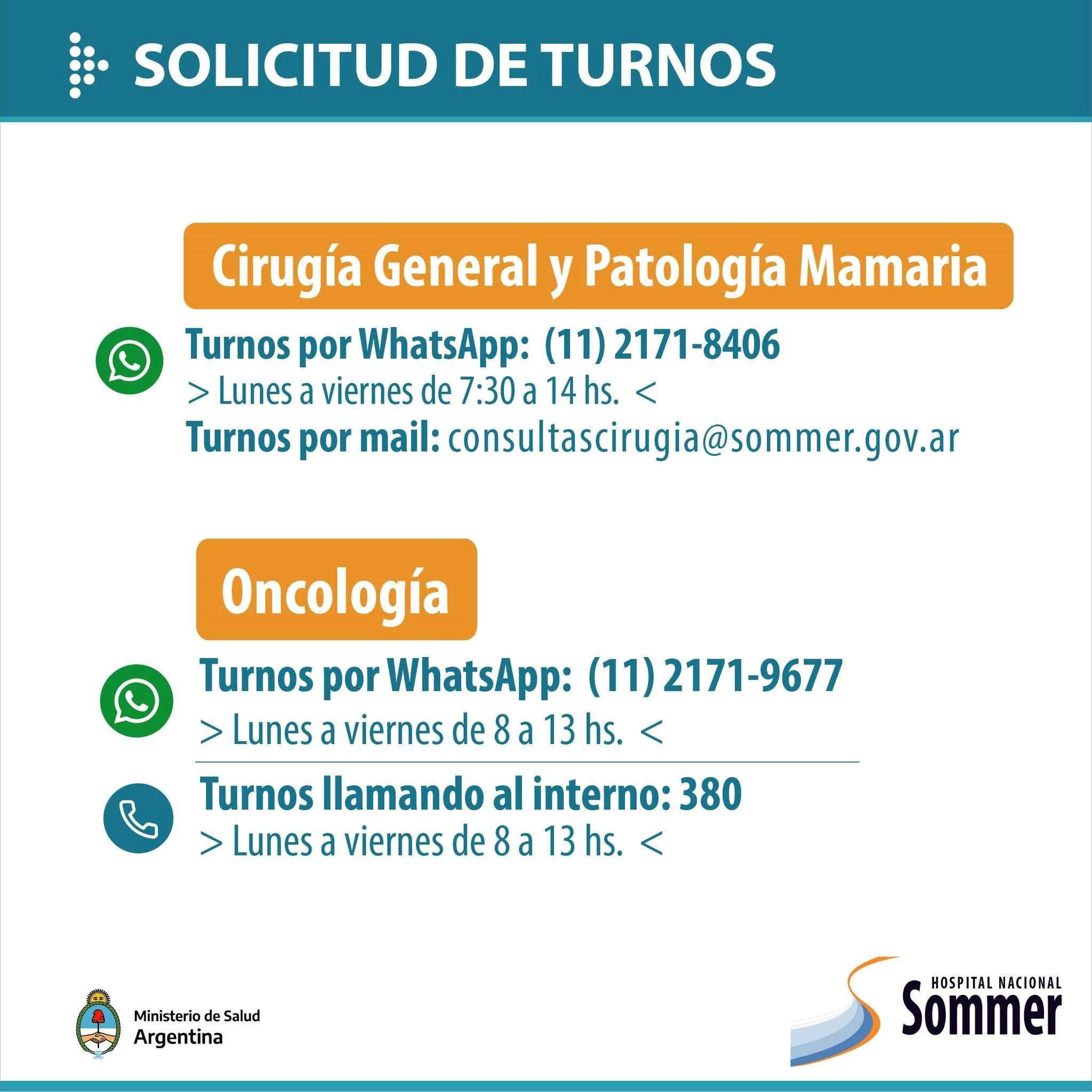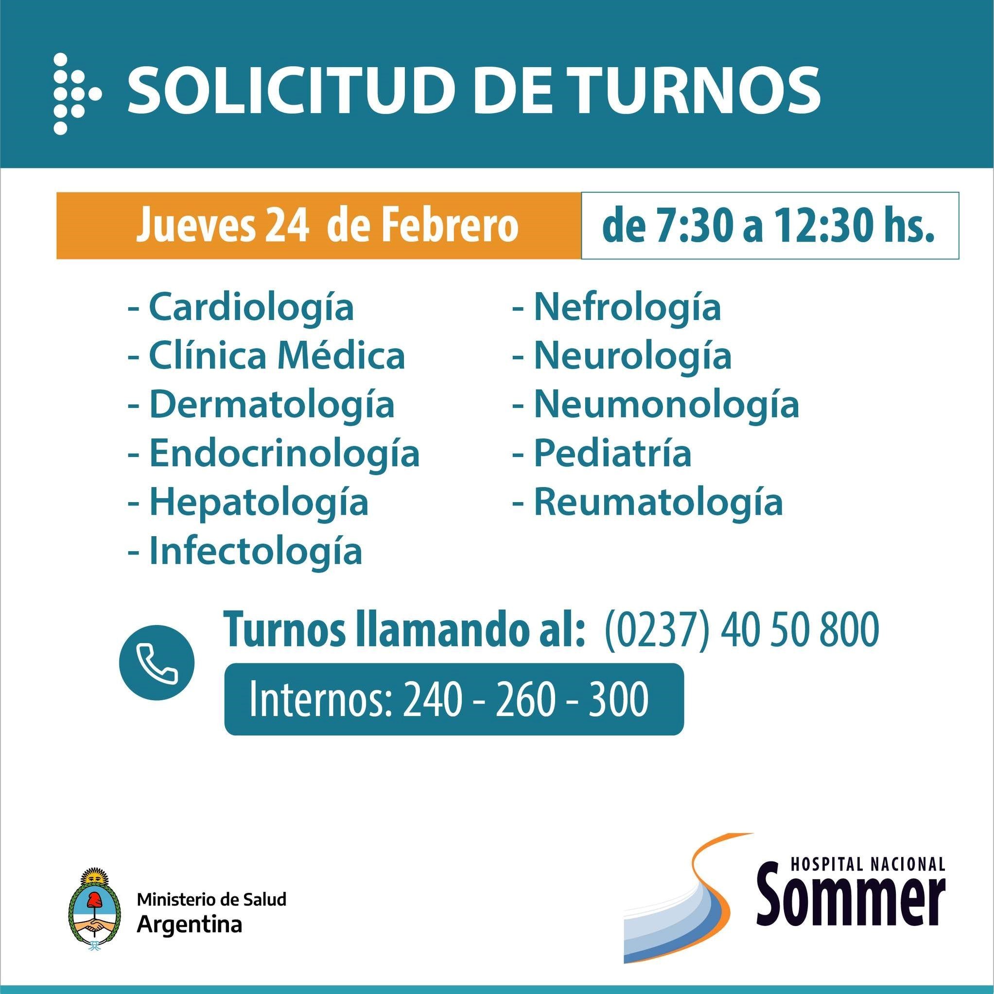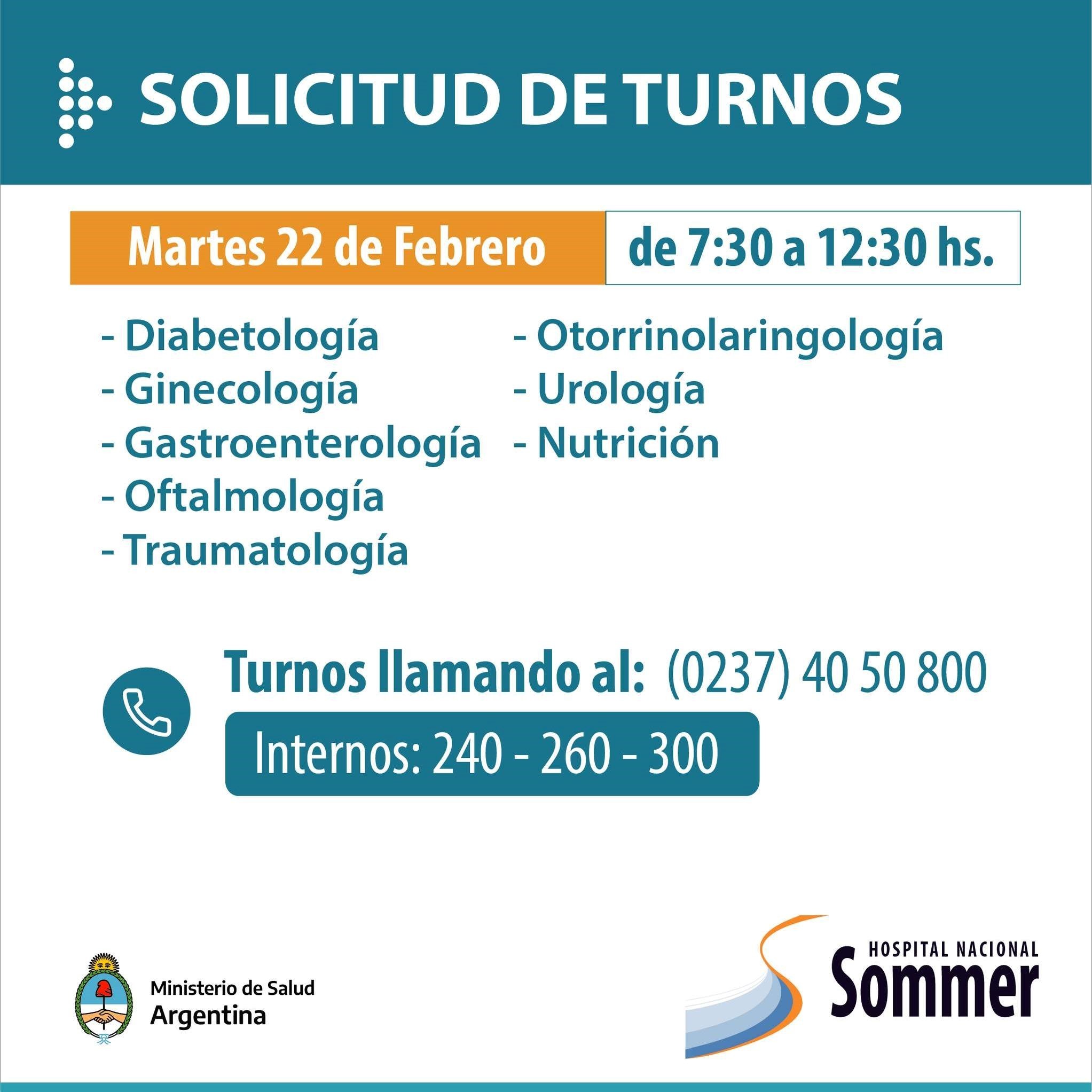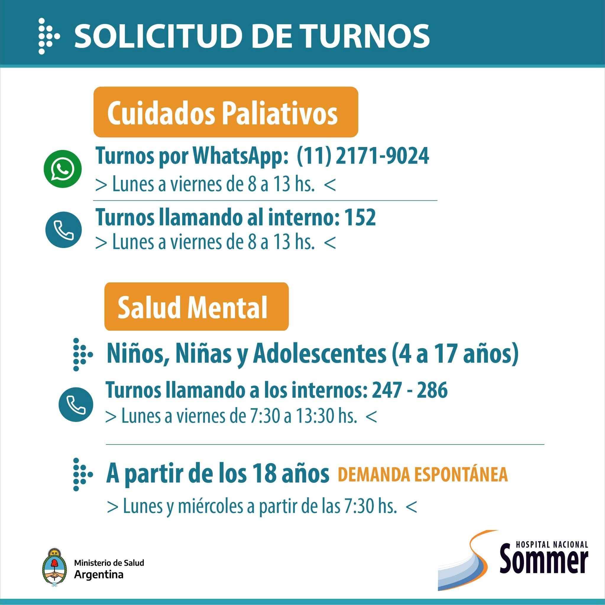 A través de sus redes sociales el Hospital Nacional Baldomero Sommer informó que se encuentra habilitada su agenda de turnos para las diversas especialidades que brinda: Cirugía, Salud mental, Cuidados Paliativos, Oncología, Rehabilitación Pediátrica y Rehabilitación para adultos, entre otros.