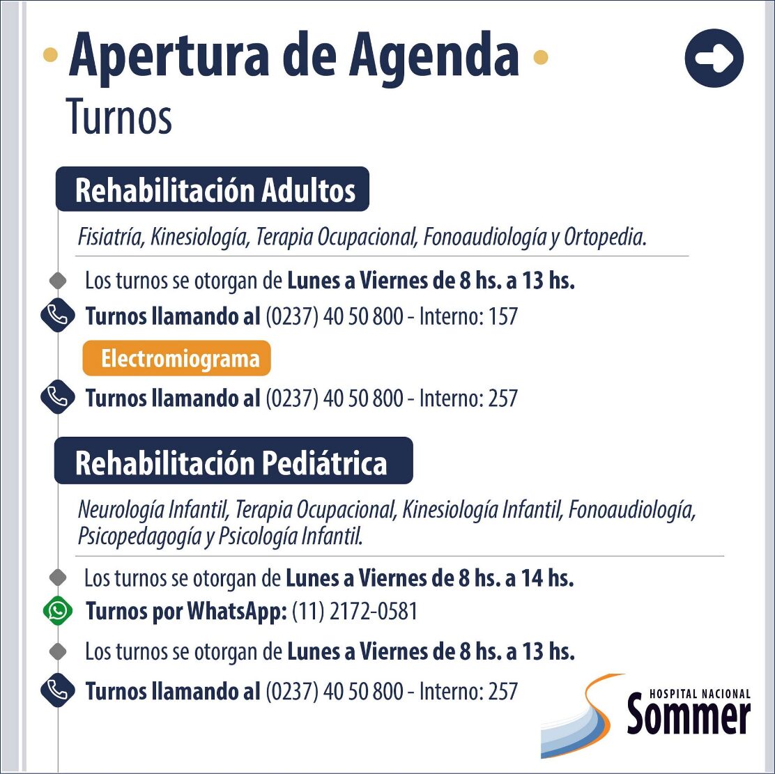 A través de sus redes sociales el Hospital Nacional Baldomero Sommer informó que se encuentra habilitada su agenda de turnos para las diversas especialidades que brinda: Ginecología, Diabetología, Nutrición, Neurología, Cardiología, Salud Mental, entre otros.