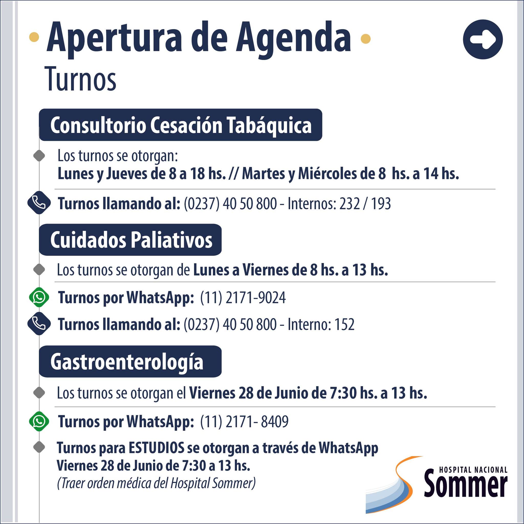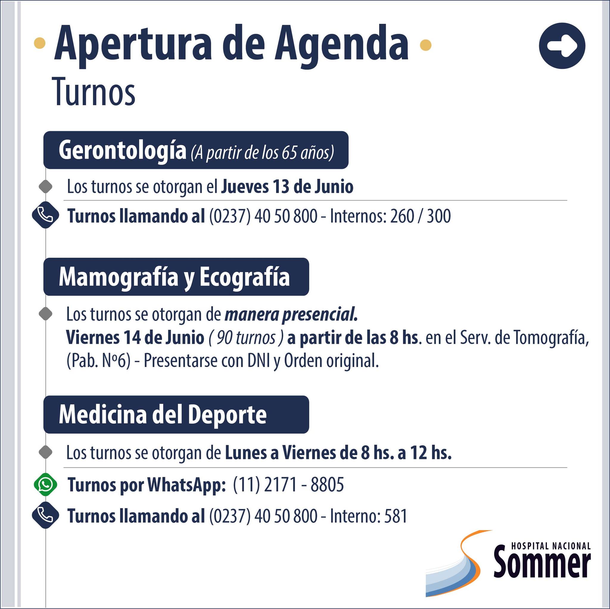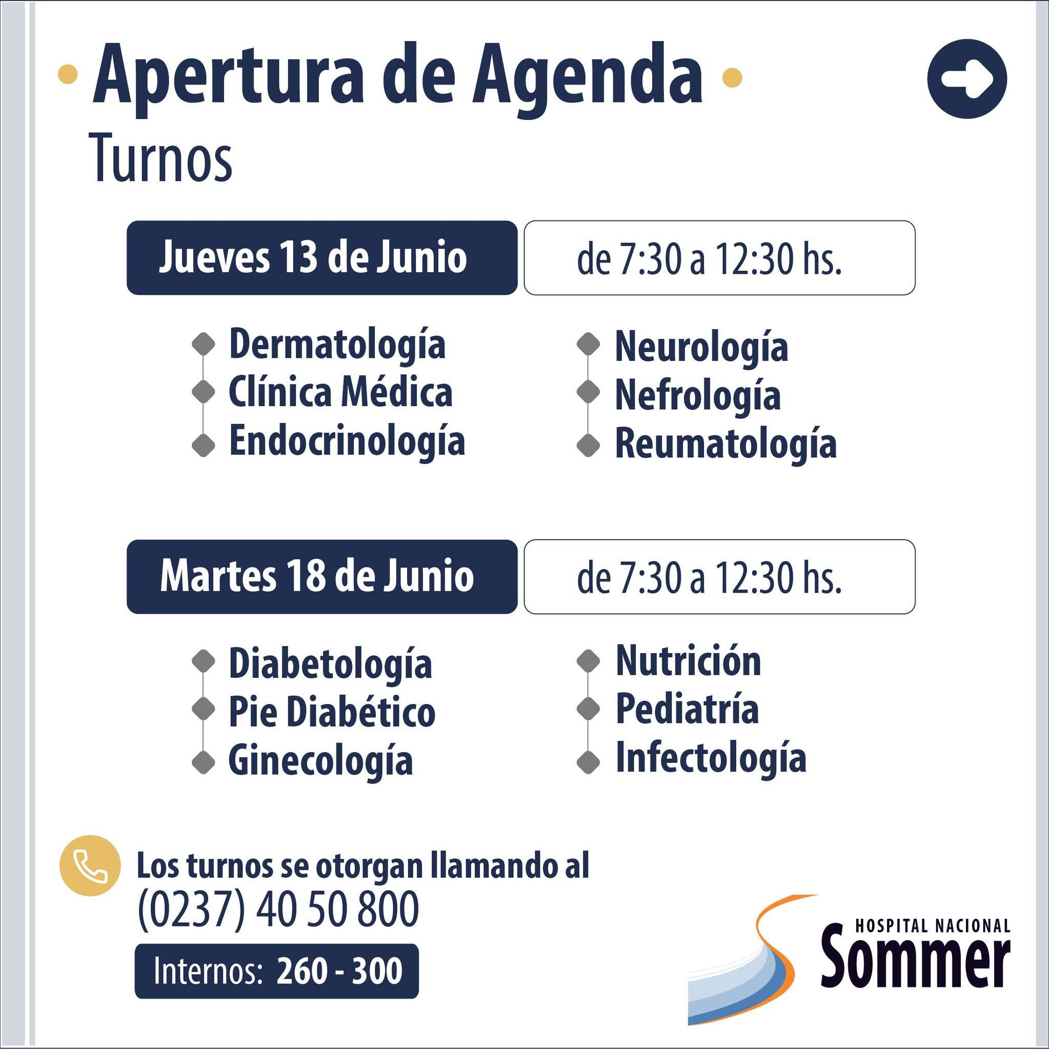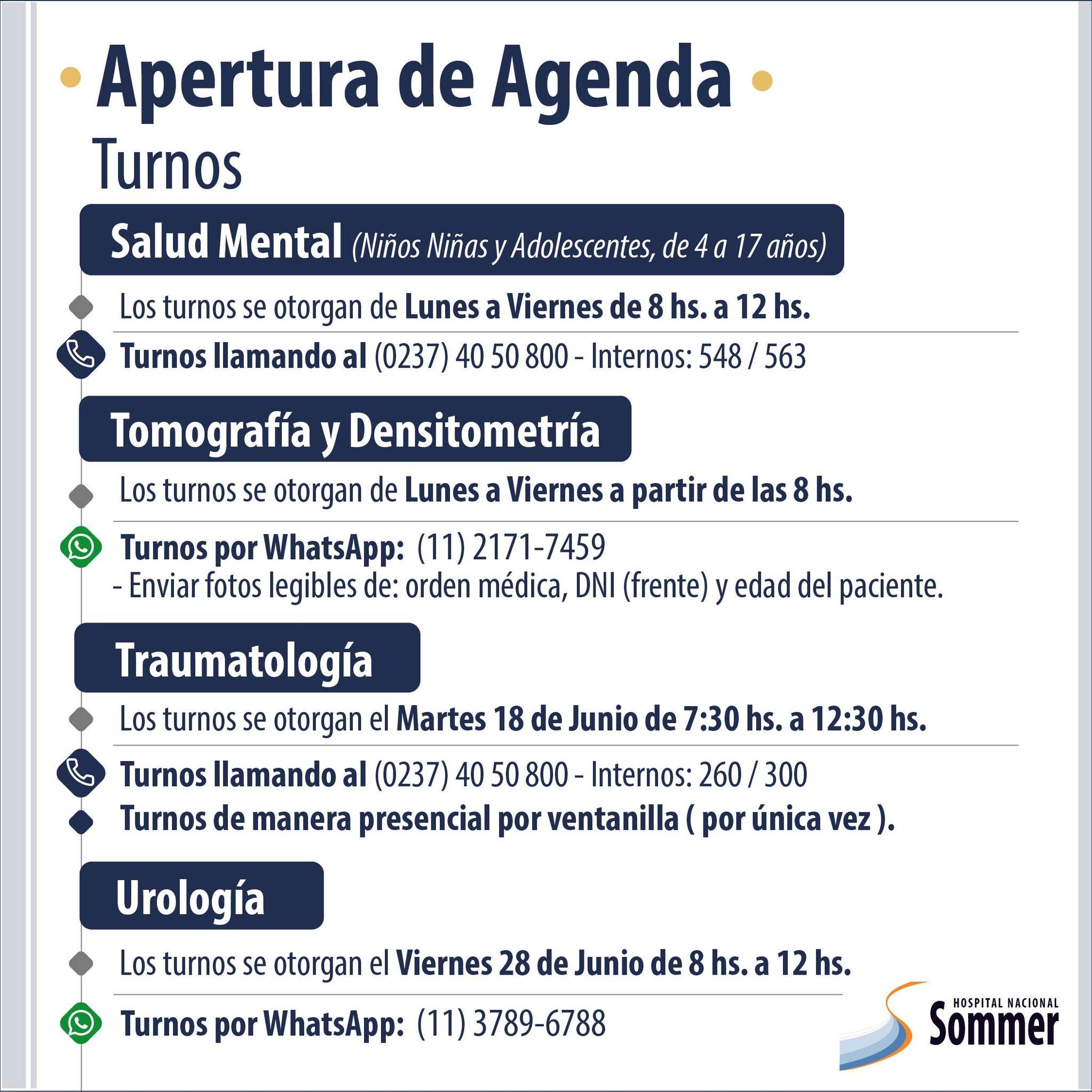 A través de sus redes sociales el Hospital Nacional Baldomero Sommer informó que se encuentra habilitada su agenda de turnos para las diversas especialidades que brinda: Ginecología, Diabetología, Nutrición, Neurología, Cardiología, Salud Mental, entre otros.
