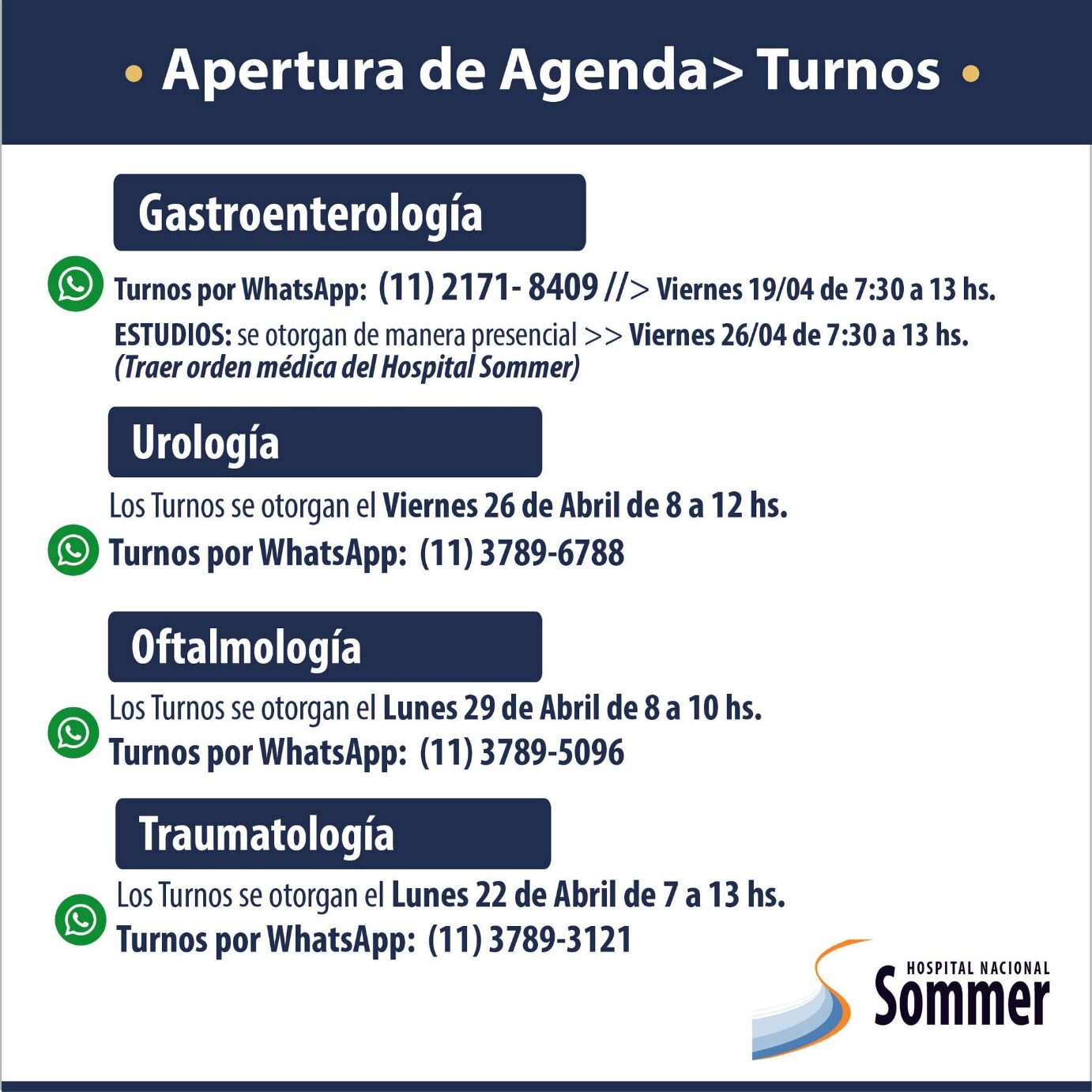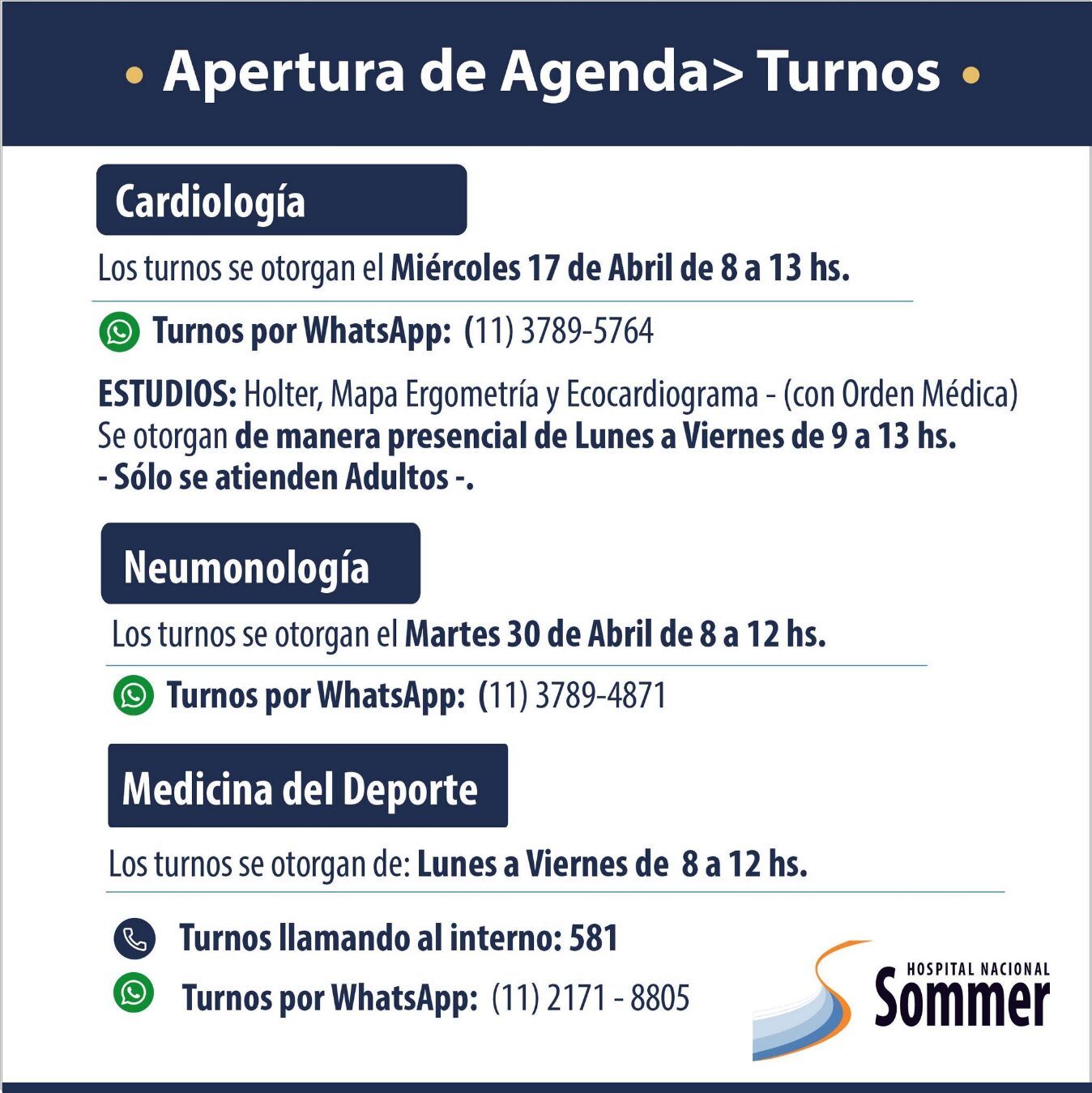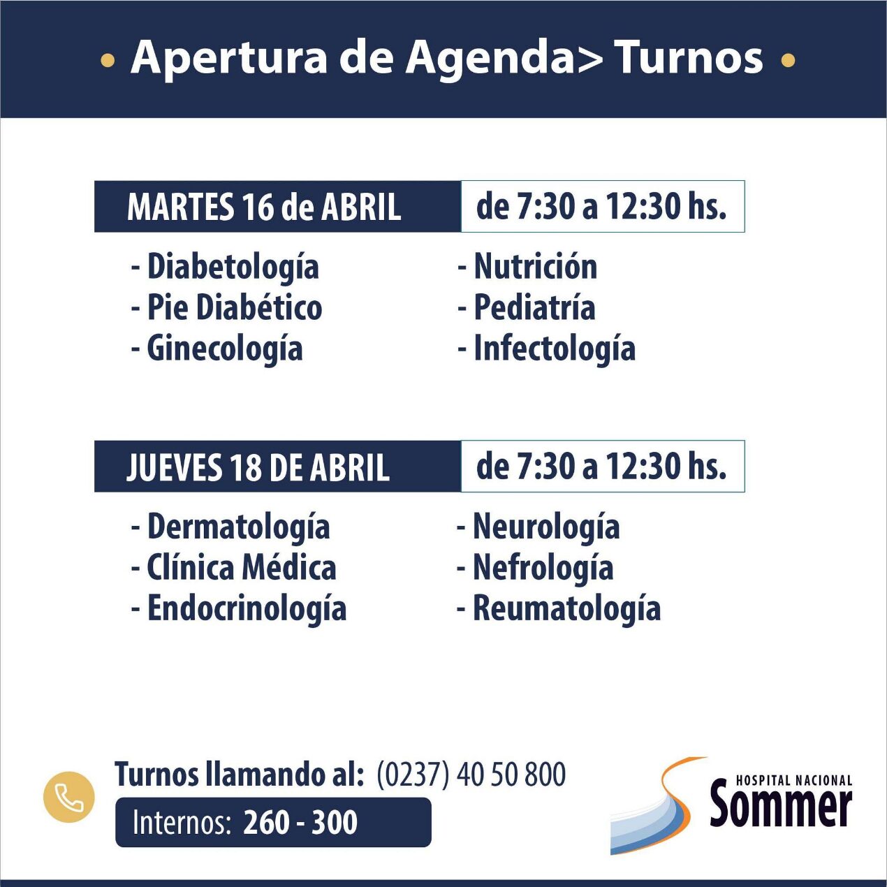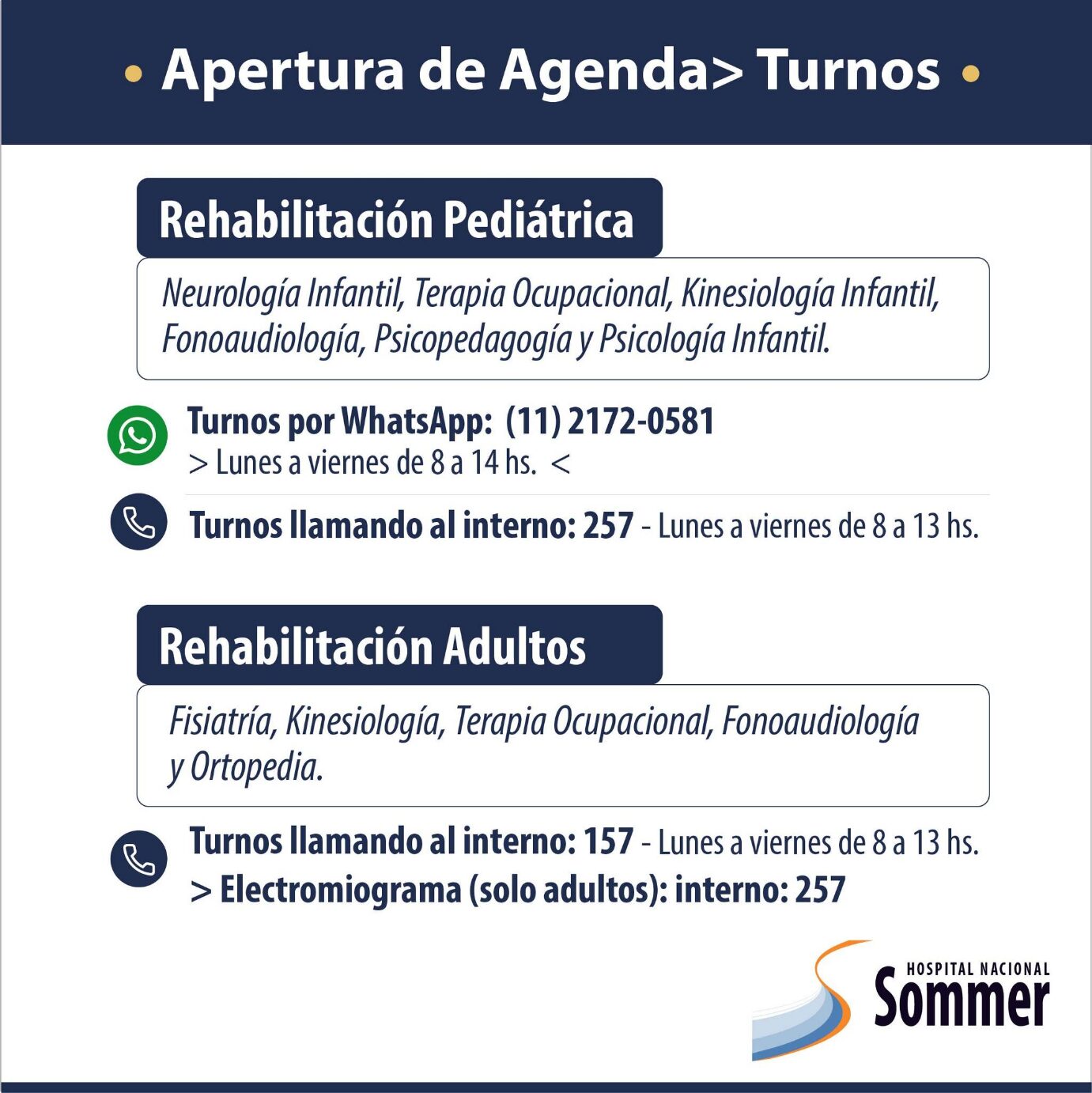 A través de sus redes sociales el Hospital Nacional Baldomero Sommer informó que se encuentra habilitada su agenda de turnos para las diversas especialidades que brinda: Ginecología, Diabetología, Nutrición, Neurología, Cardiología, Salud Mental, entre otros.