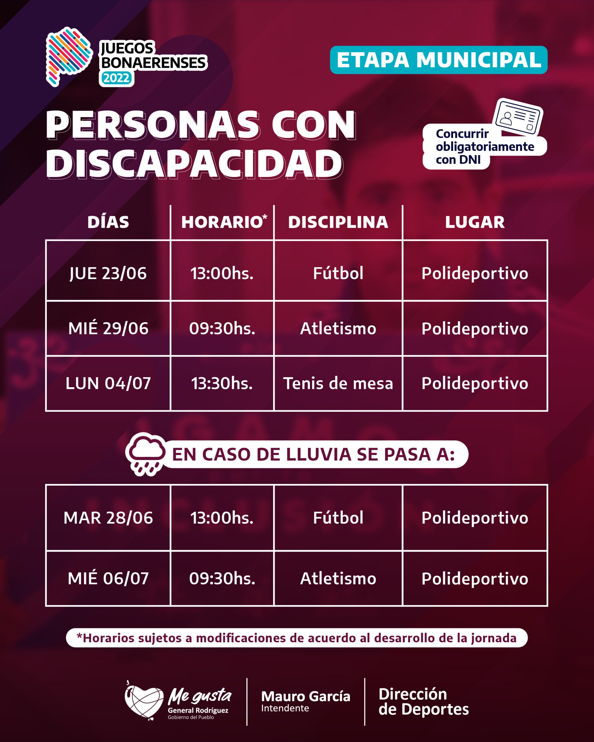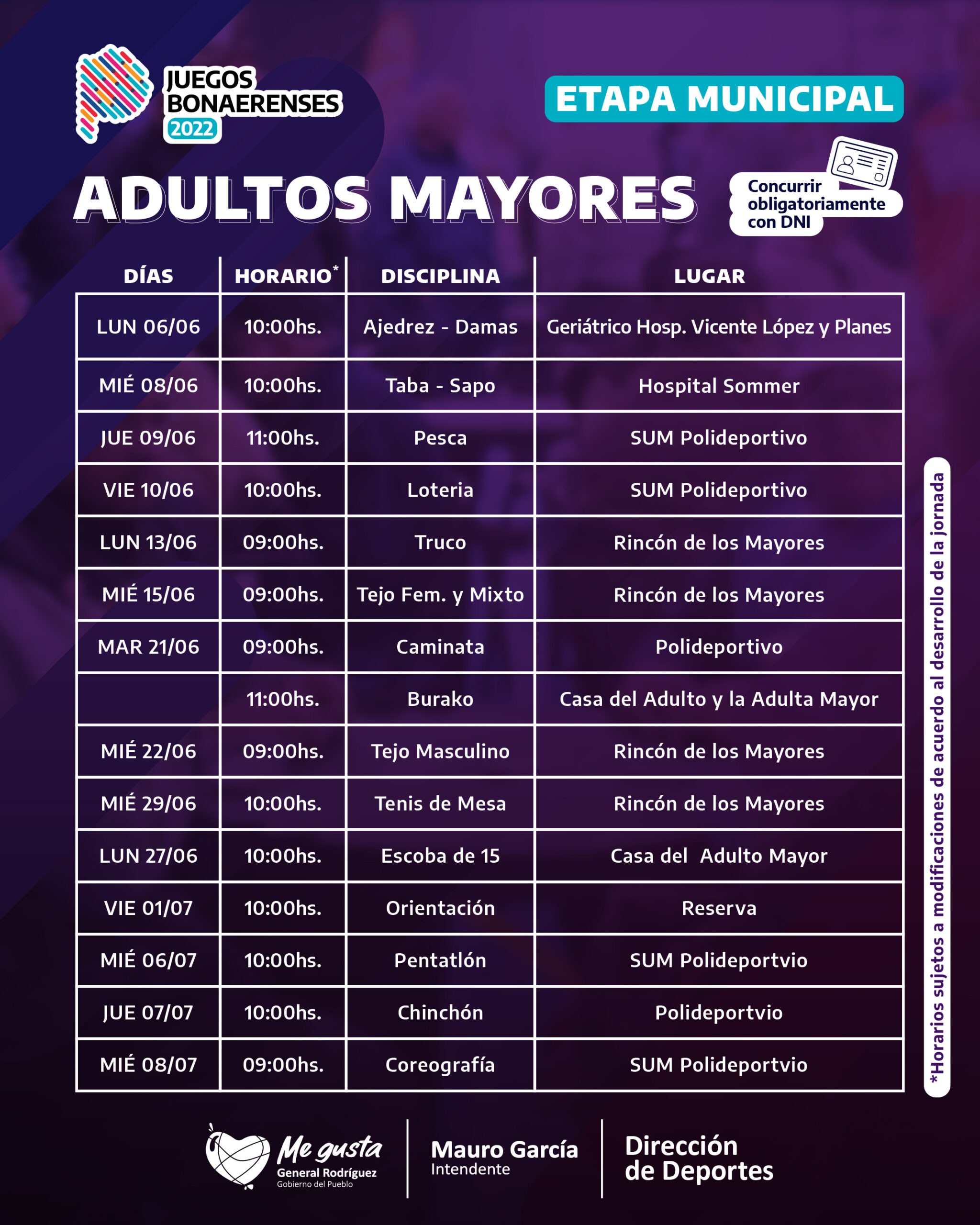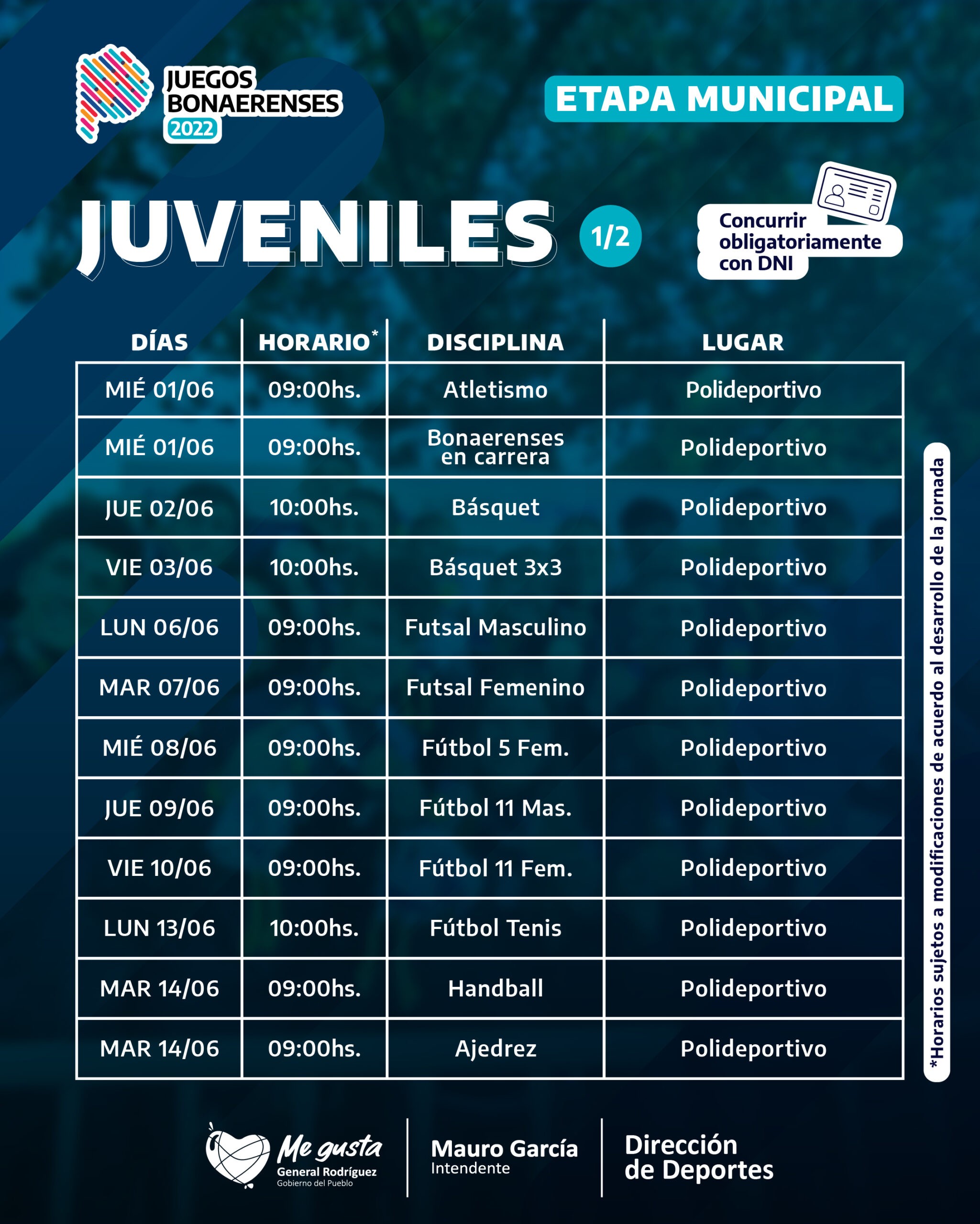 Las competencias de la etapa local se realizarán en varias jornadas entre los meses de junio y julio, en el Polideportivo Municipal Juan Ávila y el Polideportivo Municipal Marabó, la Casa del Adulto y la Adulta Mayor, la Reserva Municipal, y el Hospital Sommer, entre otros puntos de la cuidad. A continuación, el cronograma completo.