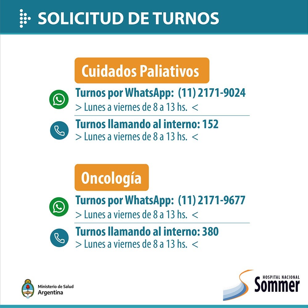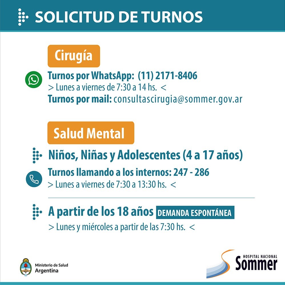 A través de sus redes sociales el Hospital Nacional Baldomero Sommer informó que se encuentra habilitada su agenda de turnos para las diversas especialidades que brinda: Cirugía, Salud mental, Cuidados Paliativos, Oncología, Rehabilitación Pediátrica y Rehabilitación para adultos.