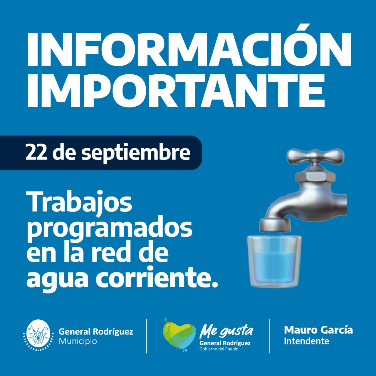El jueves 22 de septiembre es posible que el servicio de agua corriente en el barrio Bicentenario se vea interrumpido temporalmente por reformas en una cañería ubicada en la calle Camino Mercedes y Entre Ríos.