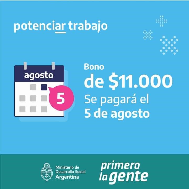 En el día de ayer, durante un acto llevado a cabo en Chapadmalal, el presidente Alberto Fernández anunció que el viernes 5 de agosto el gobierno realizará el pago de un bono de 11.000 pesos a más de 1,3 millones de personas beneficiarias del programa Potenciar Trabajo del Ministerio de Desarrollo Social. El bono fue uno de los reclamos por parte de las organizaciones sociales durante las movilizaciones que tuvieron lugar la semana pasada.
