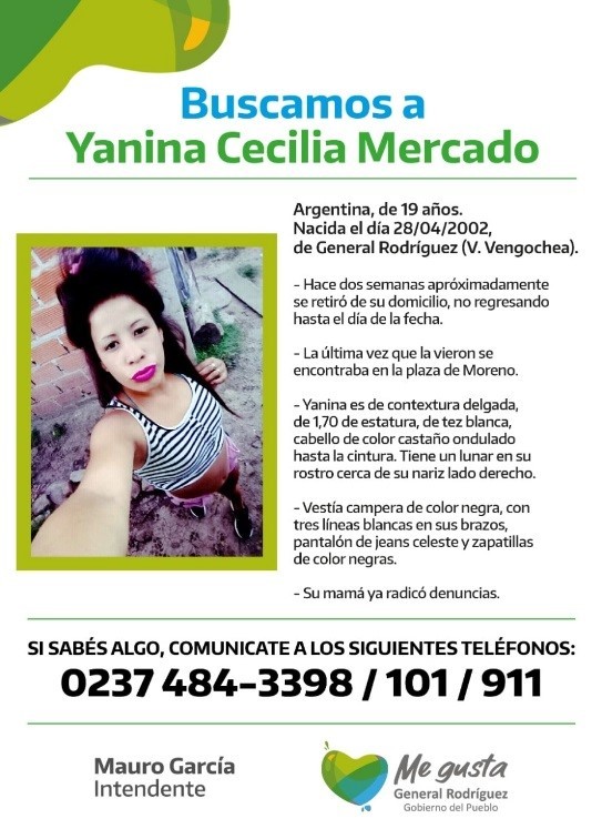 La Municipalidad de General Rodríguez emitió hoy por la mañana un comunicado donde se anuncia la búsqueda de una joven de 19 años, residente del Barrio Villa Vengochea, que está ausente de su hogar desde hace dos semanas.
