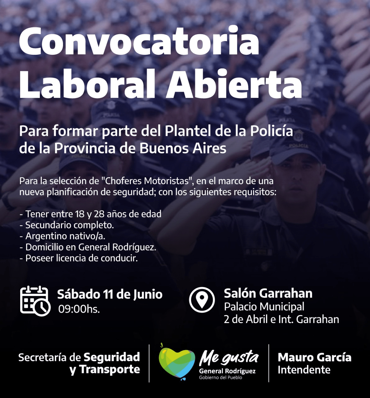 Los requisitos solicitados para postularse son tener entre 18 y 28 años de edad, contar con secundario completo, ser argentino/a nativo/a, con domicilio en General Rodríguez y poseer Licencia de Conducir.