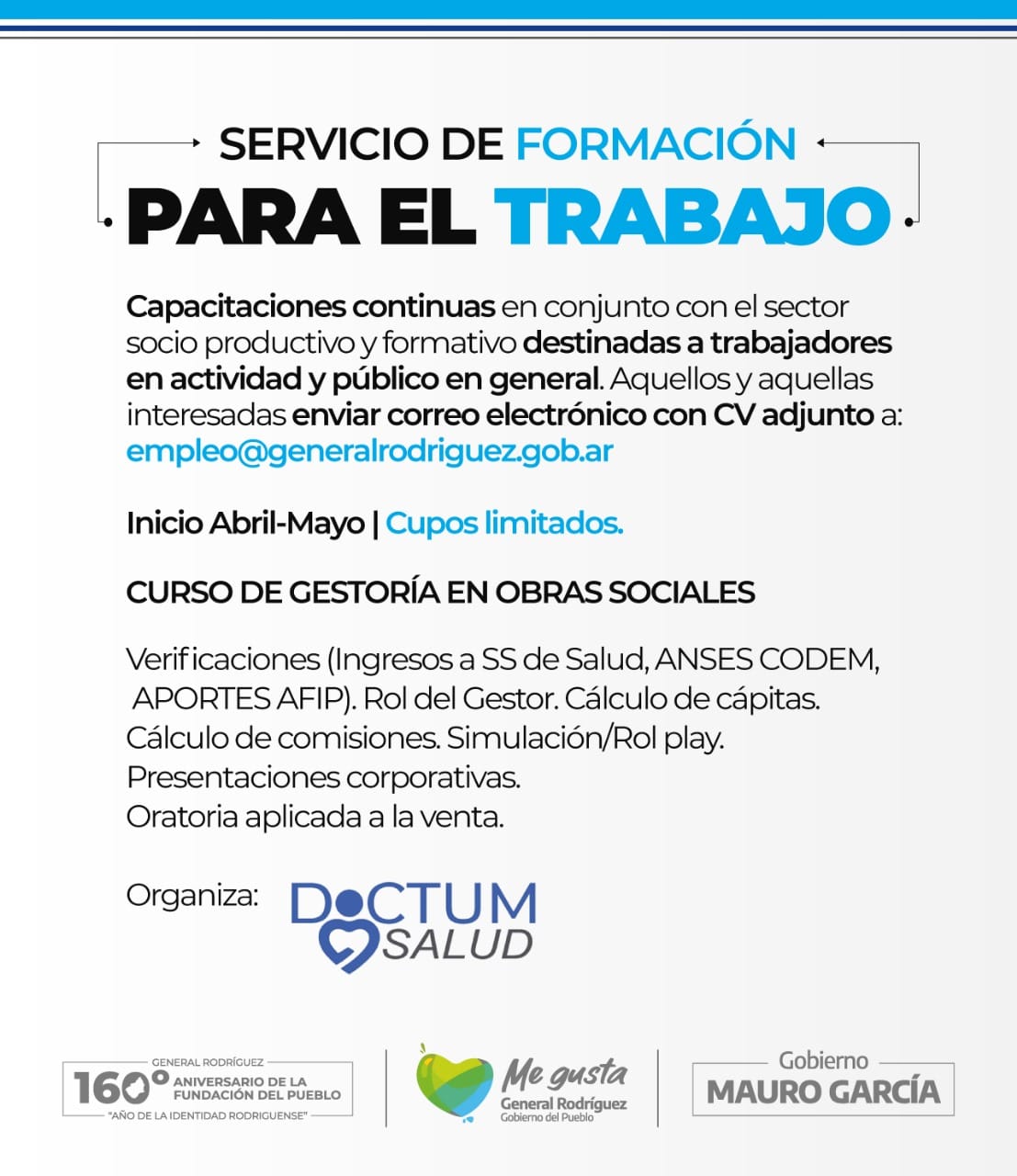 Los interesados deberán enviar un correo electrónico, con CV adjunto al mail: empleo@generalrodriguez.gob.ar