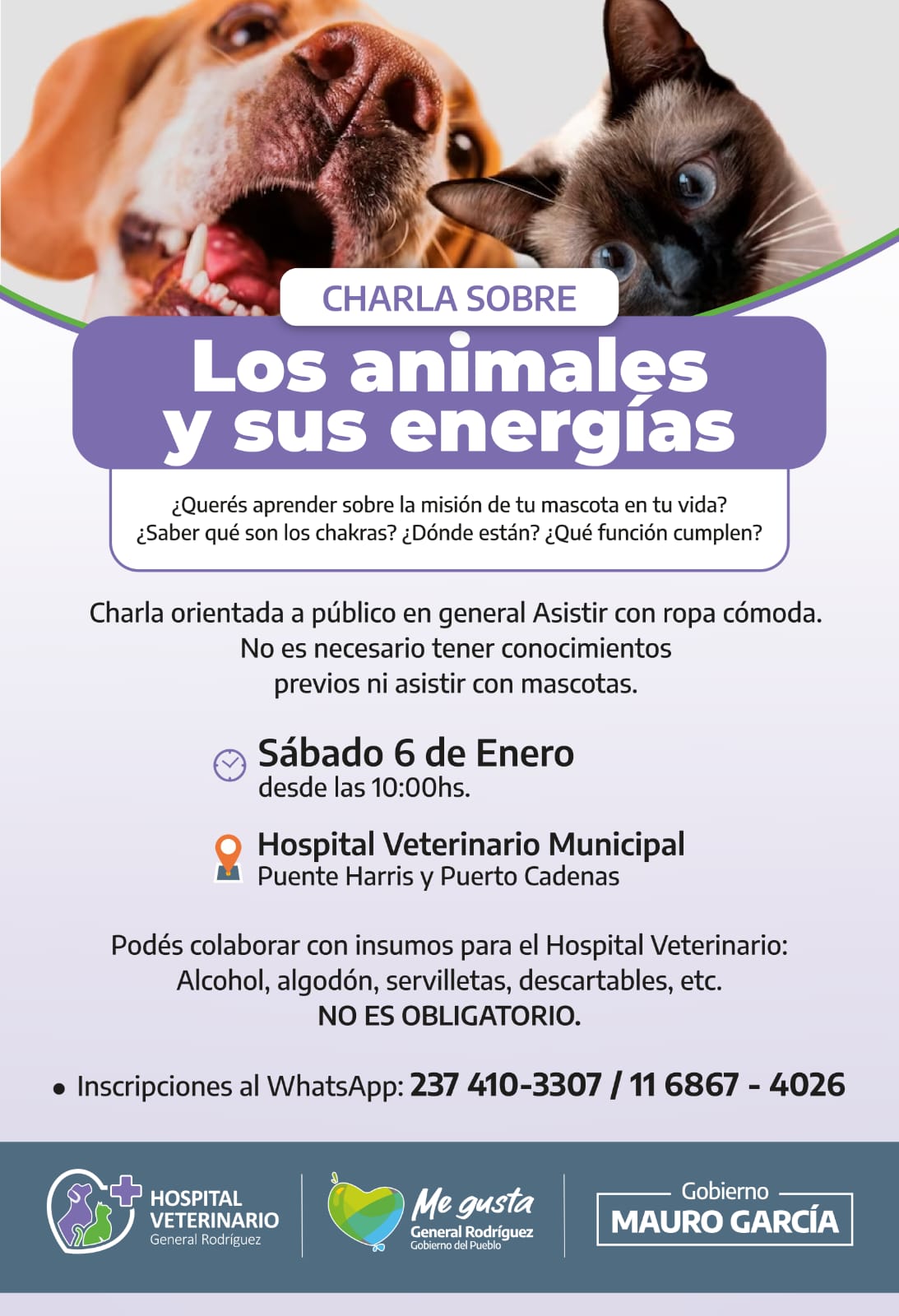 El próximo sábado 6 de enero el Hospital Veterinario Municipal realizará una charla-curso sobre “Los animales y sus energías”. La actividad será totalmente gratuita, aunque solicitan que aquellos que puedan, colaboren con algún tipo de insumo básicos para el funcionamiento del hospital, como por ejemplo Alcohol, algodón, servilletas, descartables, aunque tampoco es obligatorio.