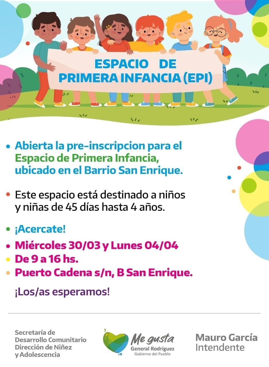 La Municipalidad de General Rodríguez informó que comenzarán a realizarse las pre-inscripciones para el Espacio de Primera Infancia (EPI) que funcionará en el barrio San Enrique, un lugar destinado al cuidado y desarrollo de niños y niñas que tengan entre 45 días y 4 años de edad.