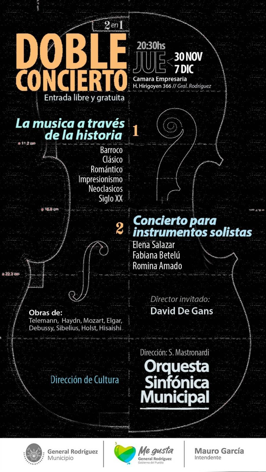 Las funciones se realizarán los jueves 30 de noviembre y 7 de diciembre, en la sede de Cámara Empresaria, en H. Hirigoyen 336. El evento será organizado por la Secretaría de Cultura de General Rodríguez, y contará con la dirección del profesor Santiago Mastronardi y el director invitado David Gans. La presentación contará con 32 músicos de cámara (es decir, con una variedad reducida de instrumentos dado el espacio) entre los miembros de la Orquesta Municipal y la Orquesta del Bicentenario que es infantil y juvenil.