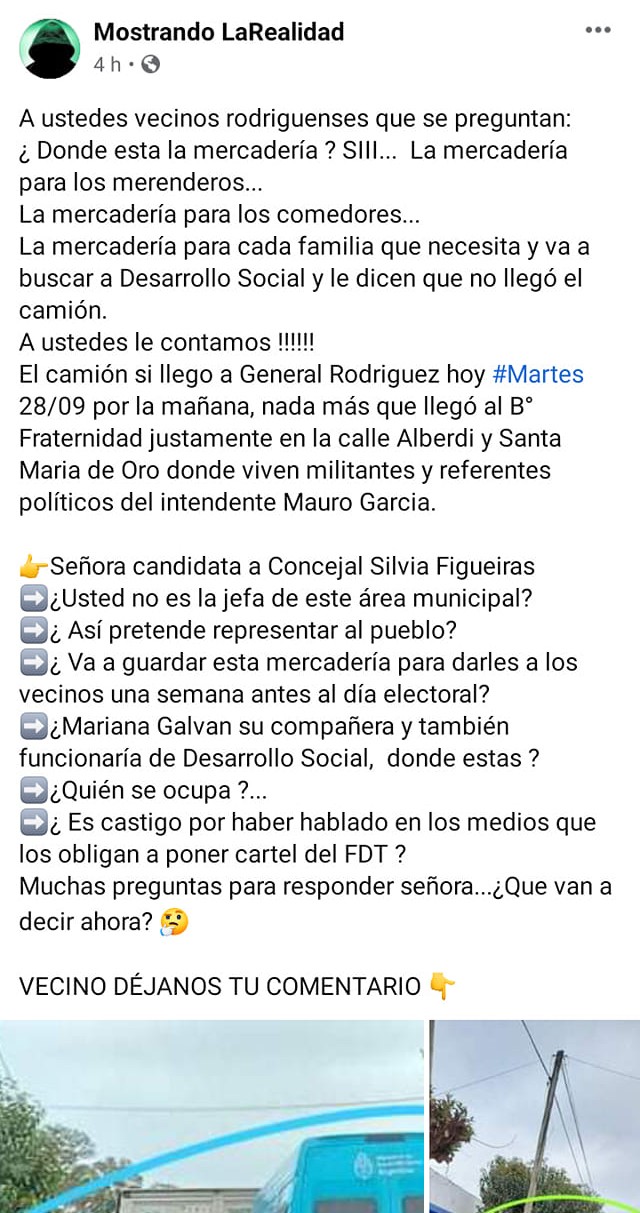 Además, en la publicación le preguntan a los vecinos: “¿Dónde está la mercadería? SIII… La mercadería para los merenderos…La mercadería para los comedores…La mercadería para cada familia que necesita y va a buscar a Desarrollo Social y le dicen que no llegó el camión”.