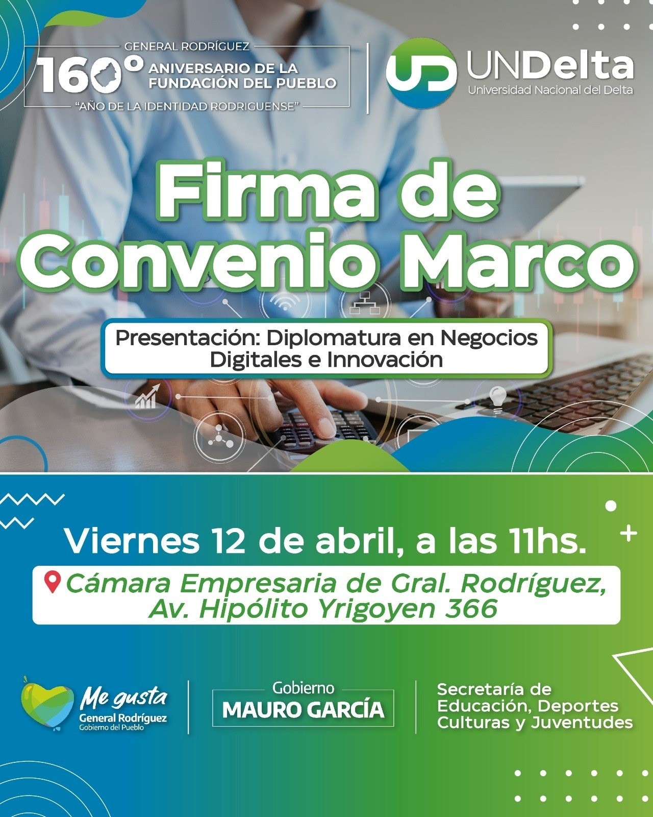 Este viernes 12 de abril el Intendente Mauro García firmará un nuevo convenio para que vecinos y vecinas puedan cursar estudios universitarios en nuestra ciudad, con la Universidad Nacional del Delta, para comenzar con la Diplomatura en Negocios Digitales e Innovación.
