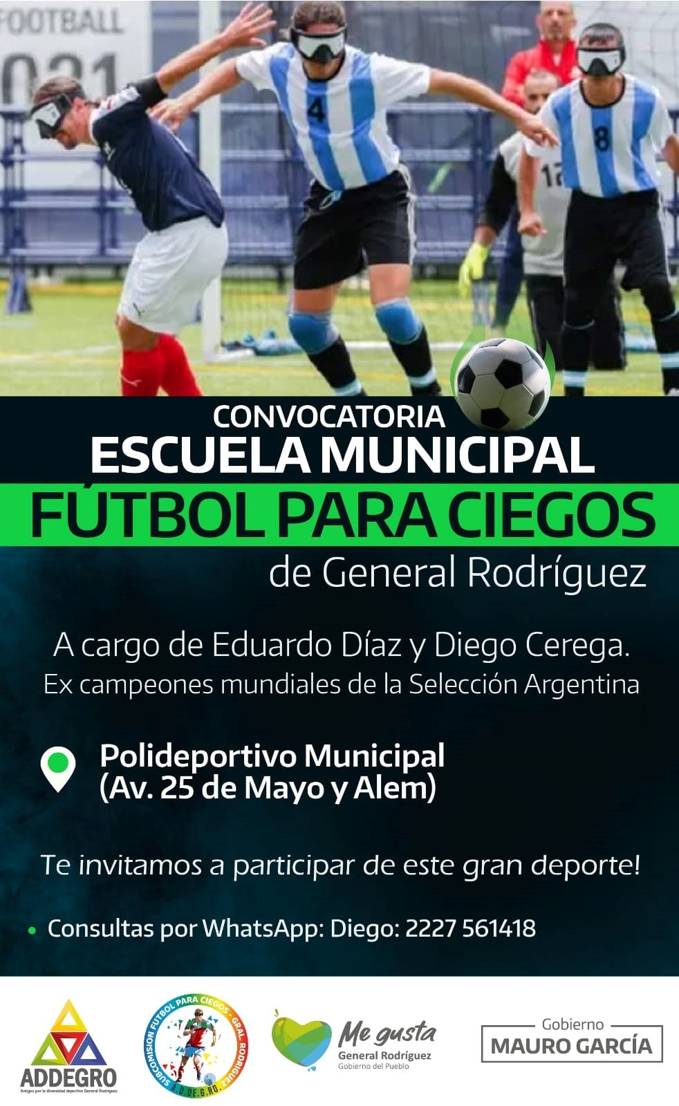 La Escuela Municipal de Fútbol para ciegos de General Rodríguez se ubica en el Polideportivo Municipal Juan Ávila, Av. 25 de Mayo y Alem, y está a cargo de Eduardo Díaz y Diego Cerega, ex campeones mundiales de la Selección Argentina y medallistas olímpicos. La misma se creó en el 2020 convocando a personas ciegas o con disminución visual severa que quieran practicar esta disciplina deportiva. Así fue como esta escuela, acompañada por el estado municipal, empezó a crecer en número incluyendo todos los géneros y franjas etáreas.