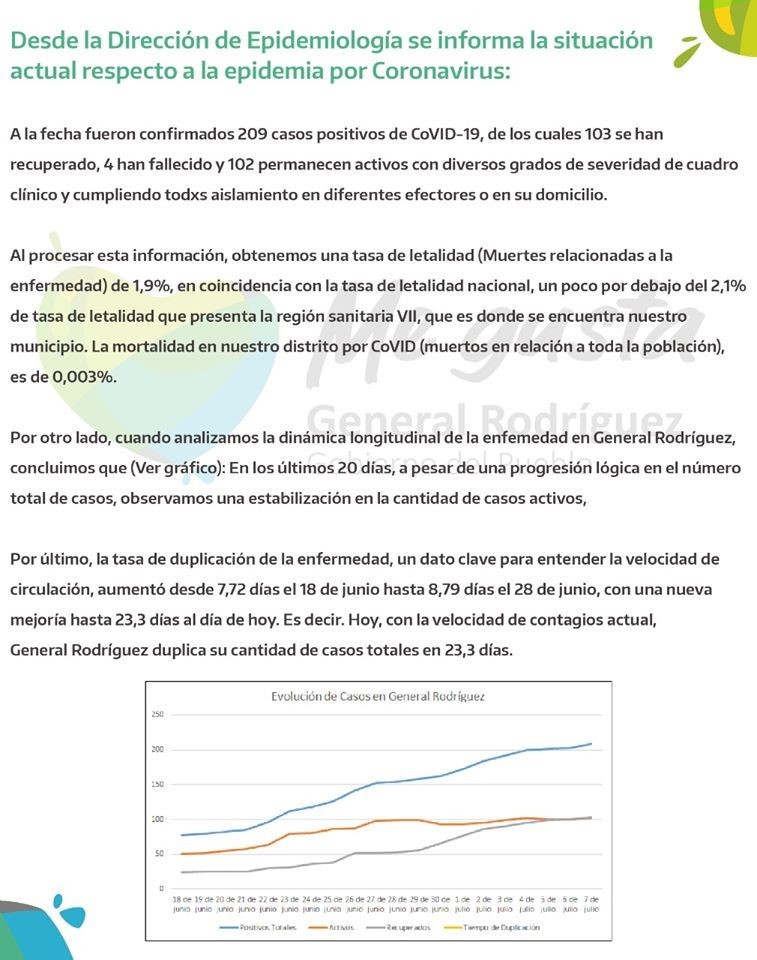 El día de hoy, según indica el informe del Comité de Crisis de General Rodríguez, se registró una nueva muerte por Coronavirus. Se trata de una mujer de 93 años.