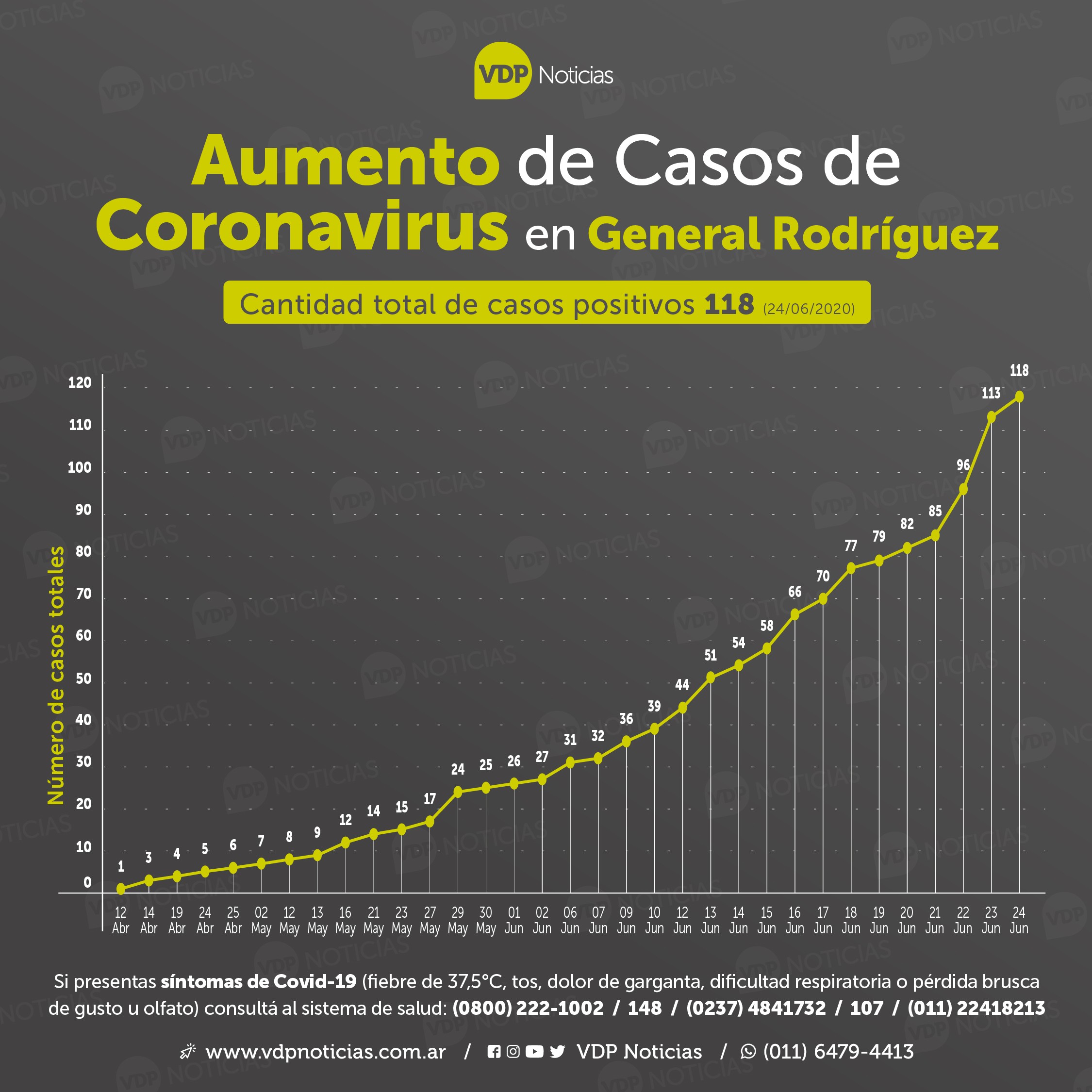 Si bien en las primeras semanas fue unos de los pocos distritos de la Región Sanitaria VII de Buenos Aires que se mantuvieron con los números de contagios relativamente bajos, el 23 de junio se sobrepasó los 100 positivos, hasta llegar al día de hoy que ya son 118.