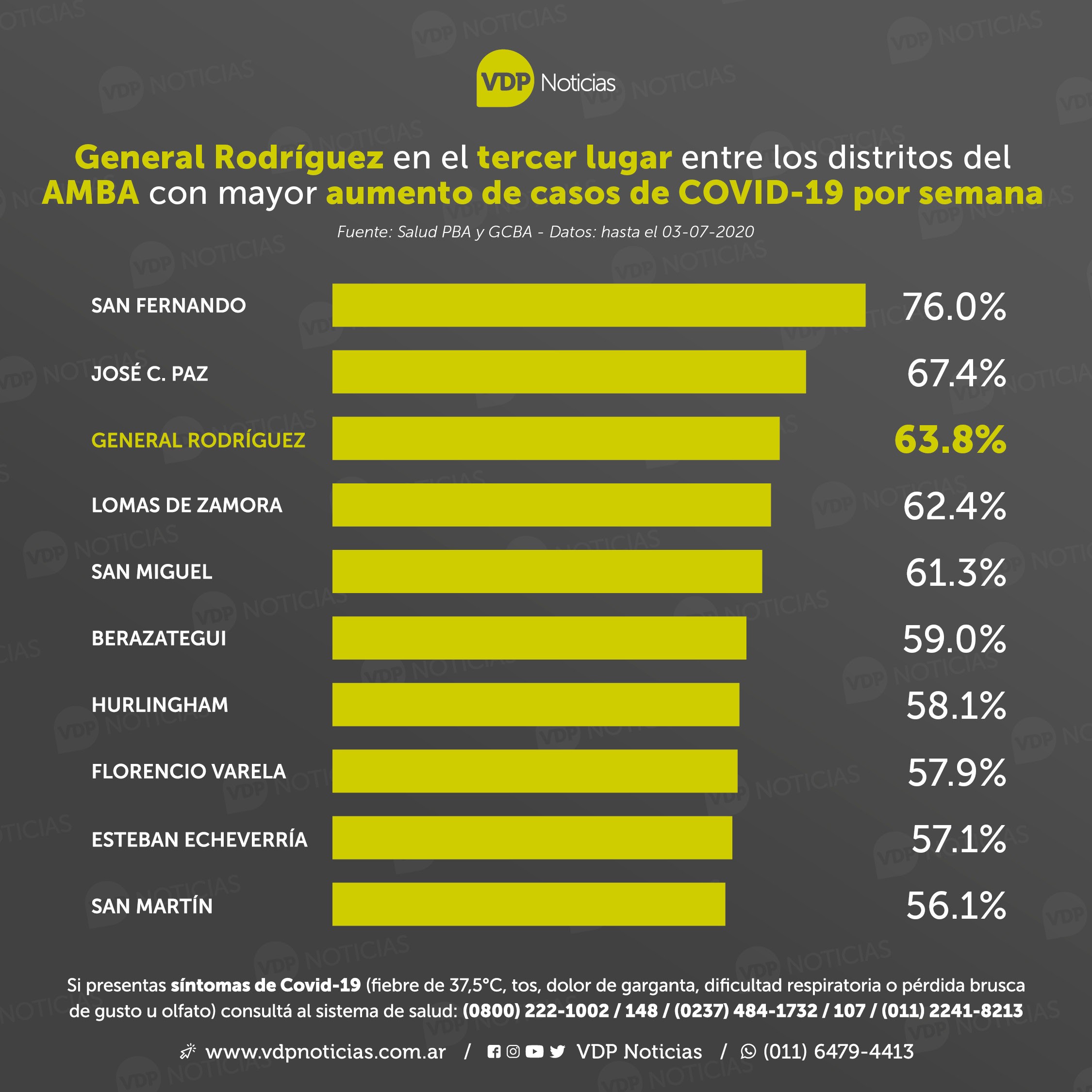 GENERAL RODRÍGUEZ ENTRE LOS DISTRITOS DEL AMBA CON MAYOR NÚMERO DE CONTAGIOS DE COVID-19 POR SEMANA (Fuente: Salud PBA y Salud GCBA)