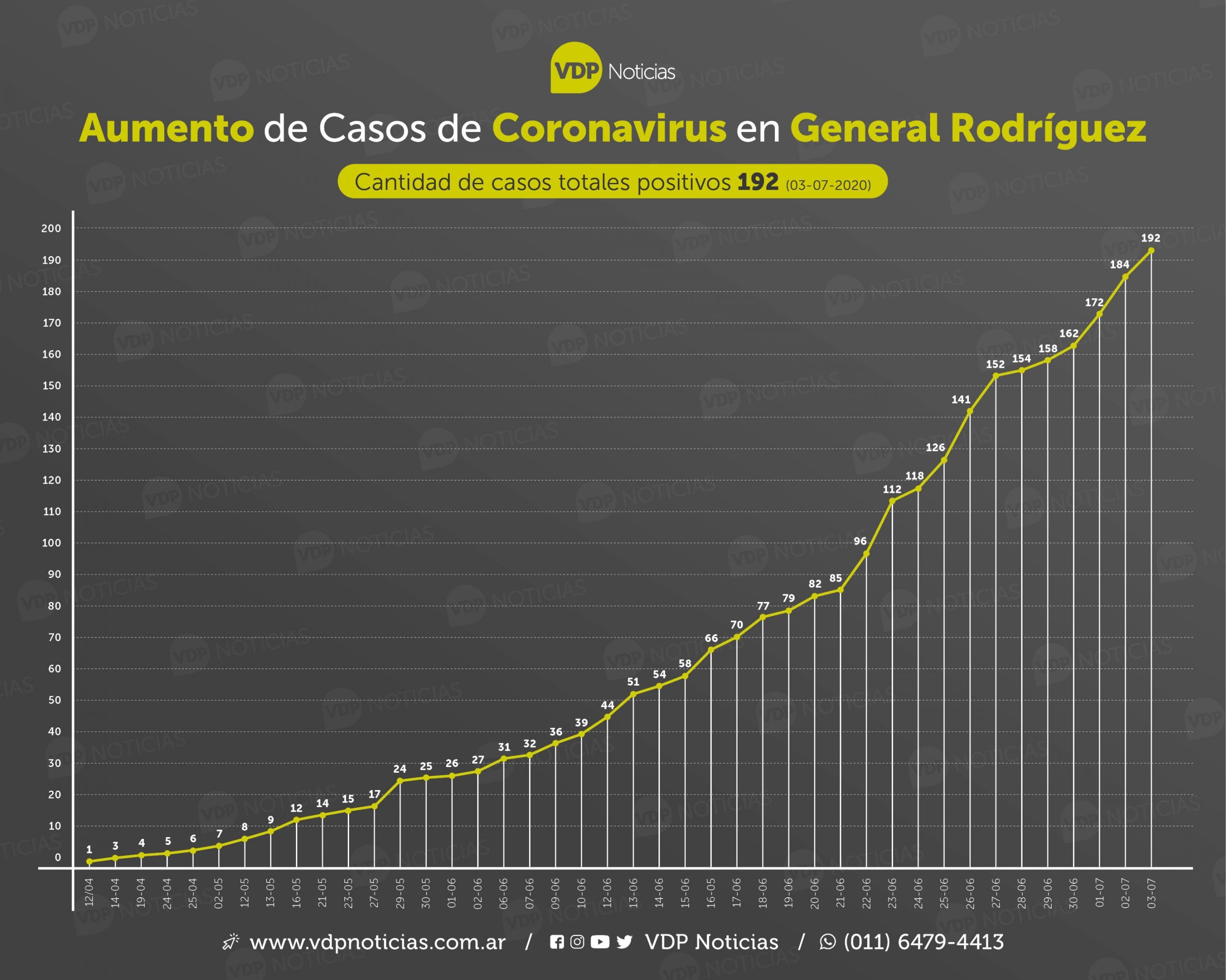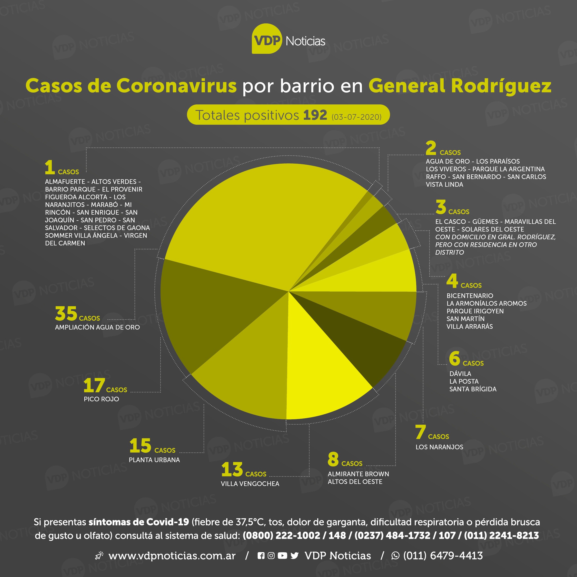 Desde que inició la pandemia de Covid-19, en General Rodríguez se han confirmado 192 casos. De ese total tres de las personas afectadas fallecieron, y unas 90 han sido dadas de altas.