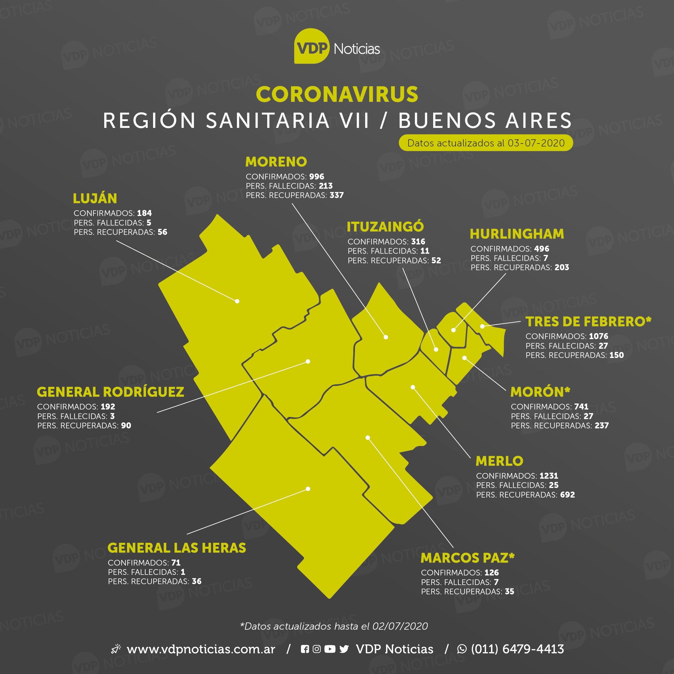 SITUACIÓN DE GENERAL RODRÍGUEZ EN COMPARACIÓN CON EL RESTO DE LOS DISTRITOS QUE COMPONEN LA REGIÓN SANITARIA VII (Fuente: redes oficiales de los municipios / Datos de Marcos Paz, Morón y Tres de Febrero actualizados hasta el día 2 de julio)