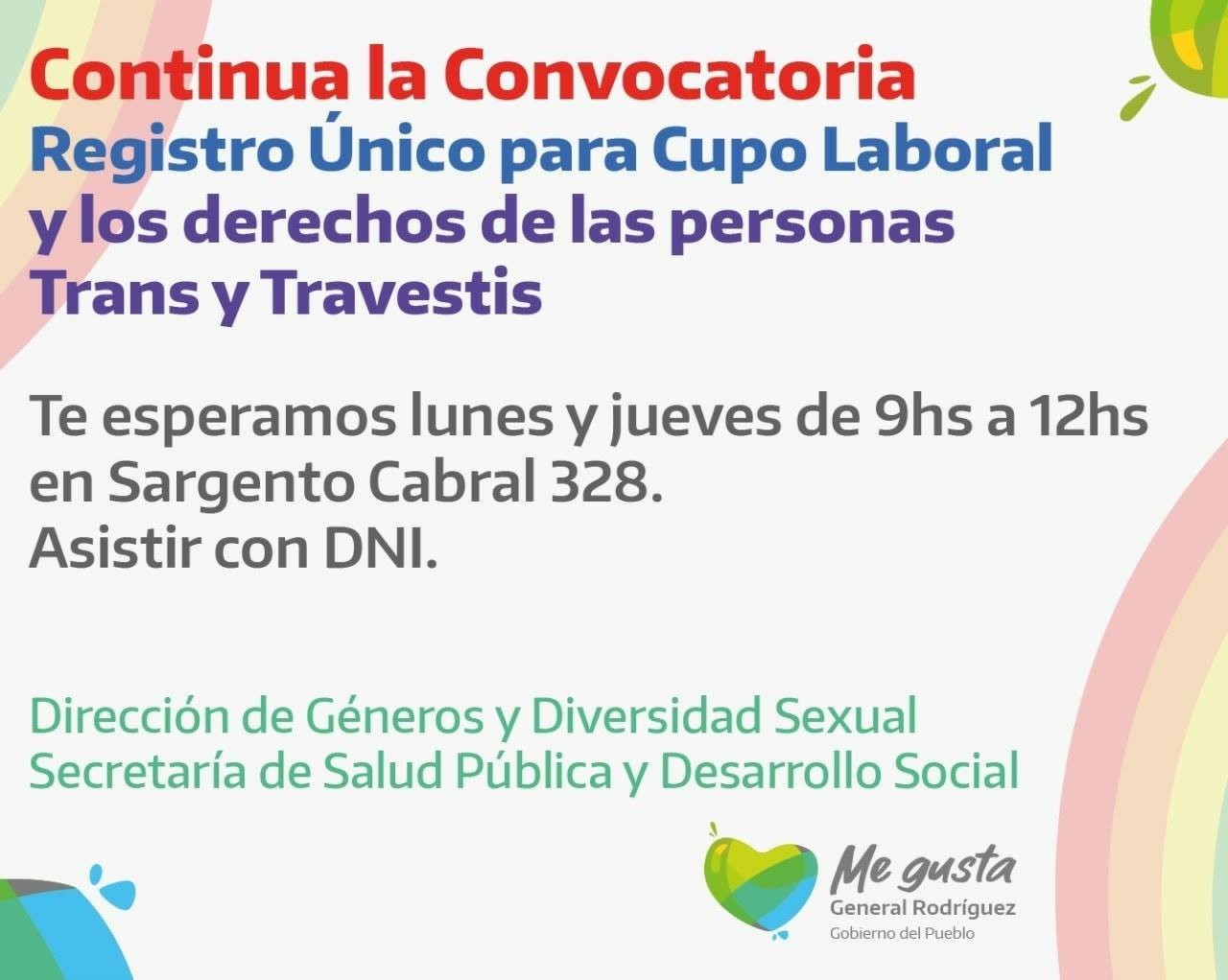 Como parte de la Secretaria de Salud Pública y Desarrollo Social, la Dirección de Géneros y Diversidad Sexual del Municipio de General Rodríguez continúa convocando a personas travestis, transexuales y transgénero para la elaboración de un registro único que se garantice sus derechos en base a la Ley N°14783 de la Provincia de Buenos Aires.