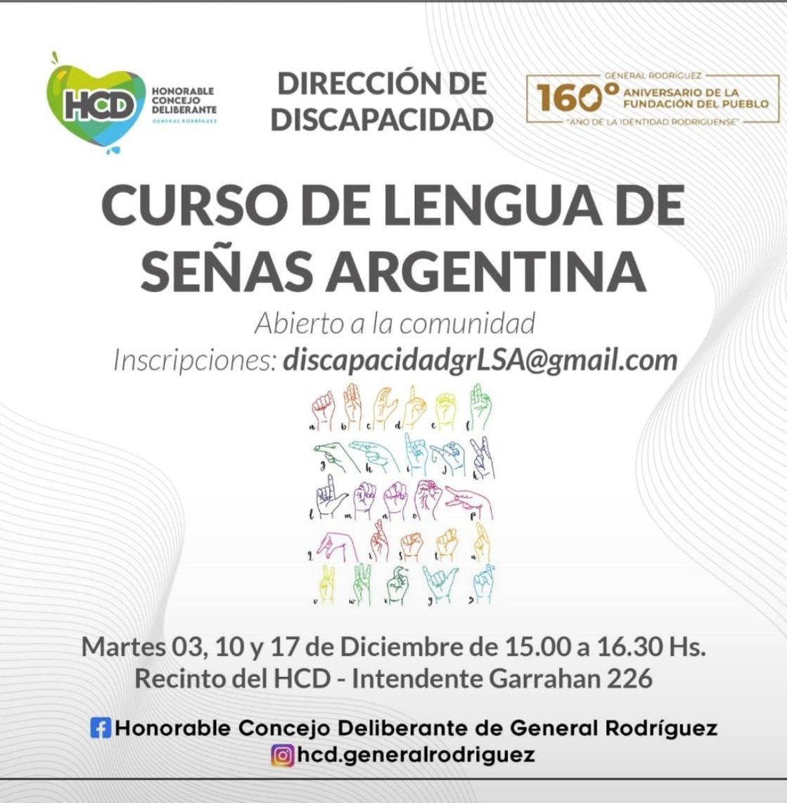 Organizado por la Dirección de Discapacidad de la municipalidad de General Rodríguez se realizará los próximos martes 3, 10 y 17 de diciembre el curso de Lengua de Señas Argentina en el recinto del Honorable Concejo Deliberante, cito en Intendente Garrahan 226.