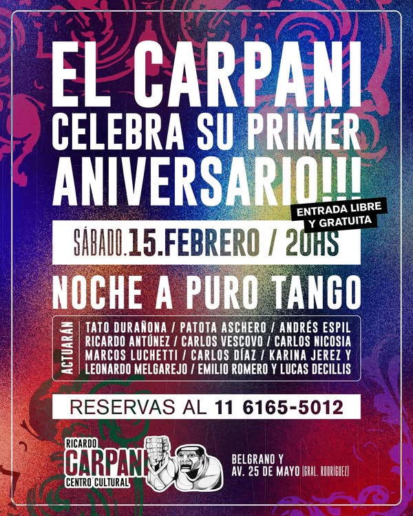 El Centro Cultural Ricardo Carpani festeja su primer aniversario, desde aquella primera peña de la resistencia, con una velada especial dedicada al tango, con el cual dicho lugar comenzó a tomar color. En febrero del año pasado, este proyecto tomó forma como un espacio de lucha y resistencia frente a tanto discurso de odio y atropello por parte del actual gobierno, con una popular peña folclórica bajo la consigna “La cultura resiste”. Un año después, el espacio creció y se fueron sumando una cantidad de propuestas artísticas, culturales y educativas destinadas a la comunidad.