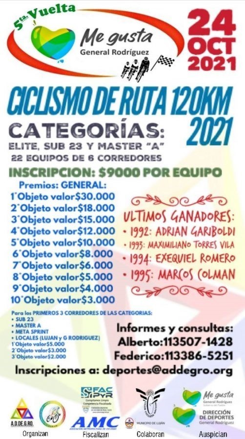 Tras 26 años de espera, el ciclismo de ruta vuelve a General Rodríguez, disciplina que se destaca por lo que conlleva en organización y logística que hacen al espectáculo, sus participantes y la seguridad pública. La carrera se llevará a cabo el día domingo 24 de octubre con largada desde la entrada del Polideportivo Juan Ávila, a las 9 horas.