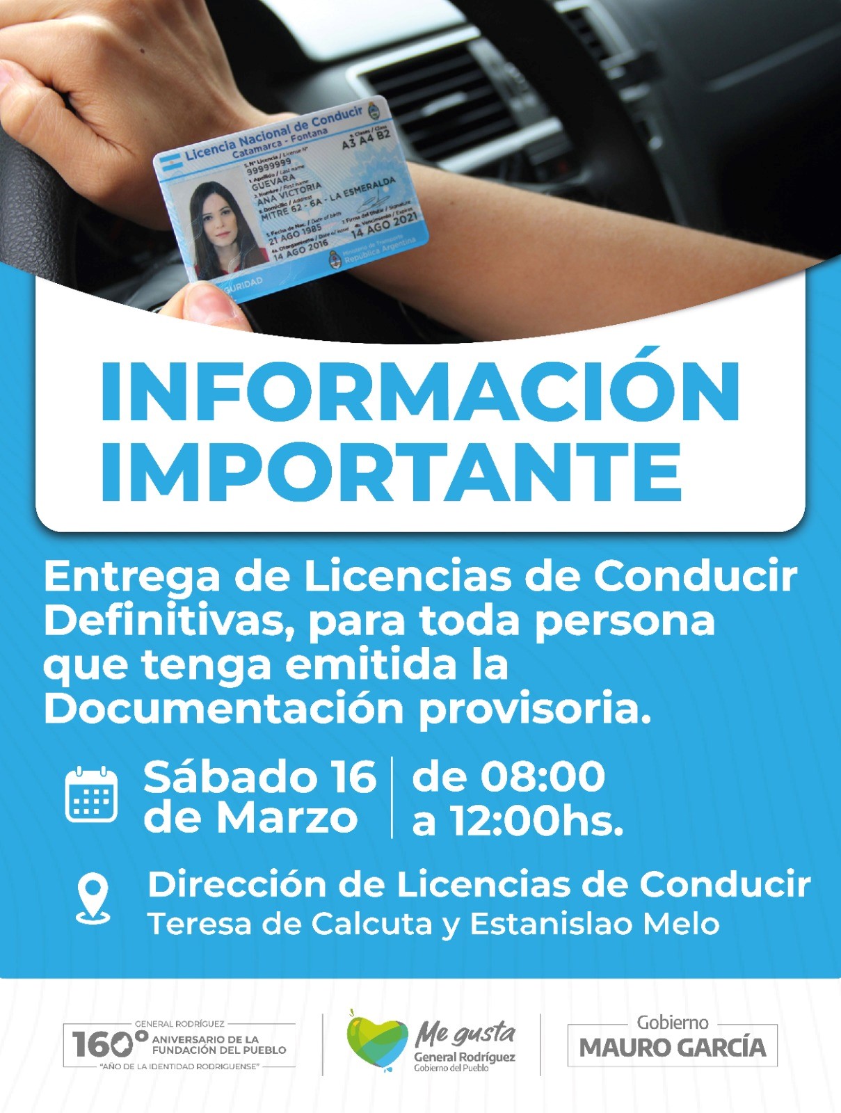 La Dirección de Licencias de Conducir informó que el próximo sábado 16 de marzo, entre las 8:00 y las 12:00 horas, llevaran adelante la entrega de las Licencias definitivas a todas y todos aquellos que hayan revisado las licencias provisorias el pasado mes.