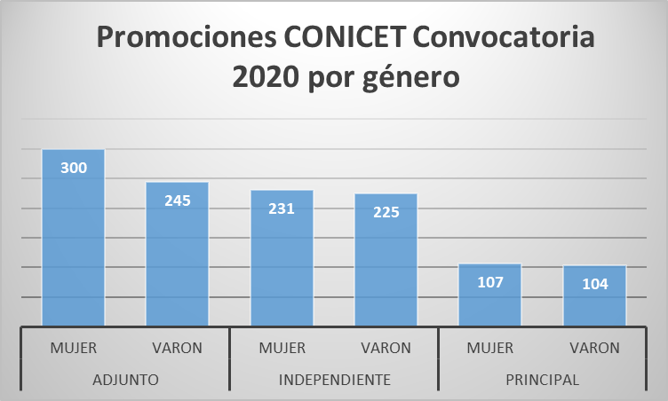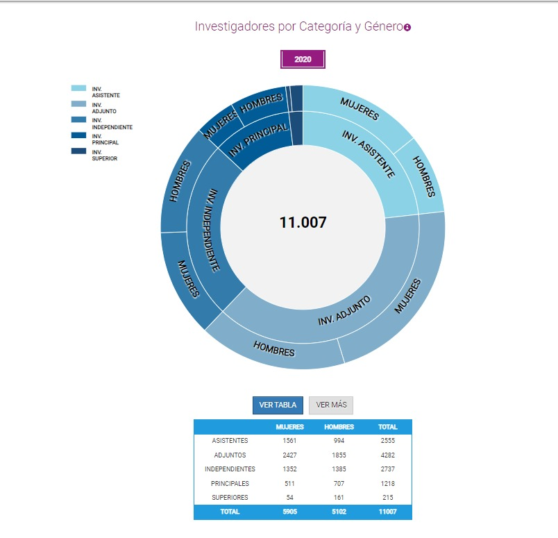 Por ejemplo, en la categoría de Investigador/a Principal, el 58% estaba representado por varones, mientras que el restante 42% correspondía a mujeres. Es notoria la masculinización de las jerarquías sobre todo, si vemos que según los datos presentados hasta el 2019, en la categoría más alta de Investigador/a Superior (categoría a la que se accede mediante la evaluación de una comisión ad hoc) el 75% de los cargos estaban ocupados por varones.