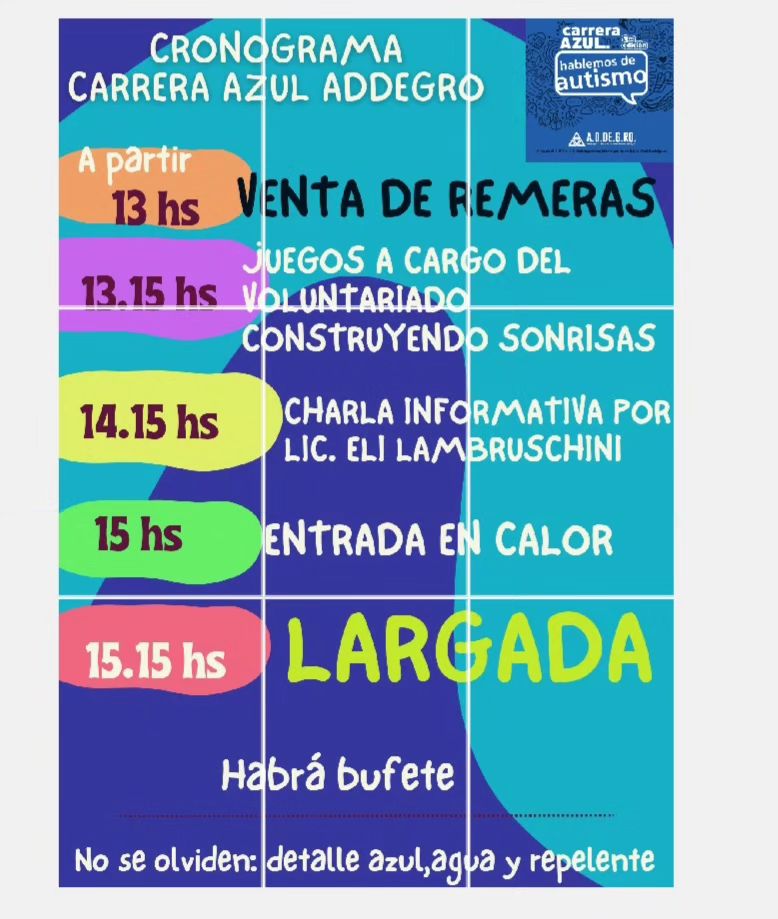 El día sábado 6 de abril se llevará a cabo, en el Polideportivo Municipal Juan Ávila, la tercera edición de la Carrera Azul organizada un año más por la asociación “Amigxs por la Diversidad Deportiva Gral. Rodríguez” (ADDEGRO), la Dirección de Deportes Municipal, a cargo de su director Pablo Bustamante, y la colaboración de ATILRA. La carrera dará inicio a las 15 horas de ese sábado.
