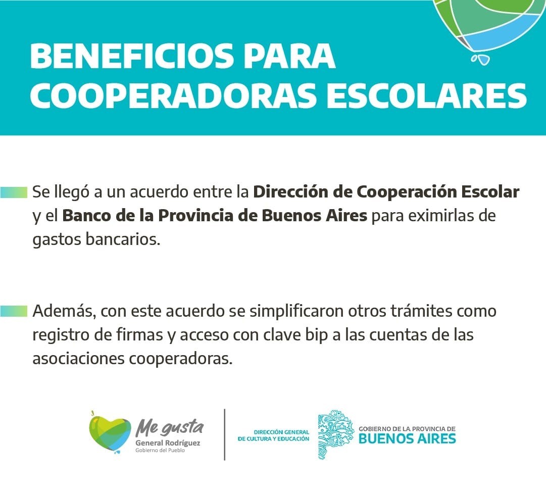 En línea con el objetivo de fortalecer el funcionamiento de las Asociaciones Cooperadoras de las escuelas bonaerenses, esta iniciativa determina la eximición del cobro de tasas de mantenimiento, comisión por extracto de cuenta, cargos por envío de avisos, emisión de resumen, chequeras y comisión por mantenimiento de cuenta de las cuentas bancarias pertenecientes a las Asociaciones de Cooperadoras Escolares.