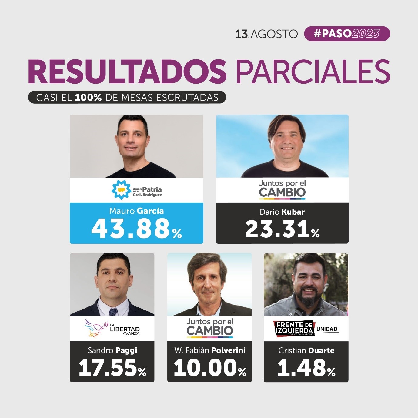 Si proyectamos los resultados de General Rodríguez a las nacionales, podemos esperar un crecimiento del oficialismo. Por otro lado, Mauro García puede ampliar su margen, pero incluso si lo achica, sigue siendo el principal favorito a ganar la general. Tanto por el desorden en la oposición, como por la ventaja que lleva.